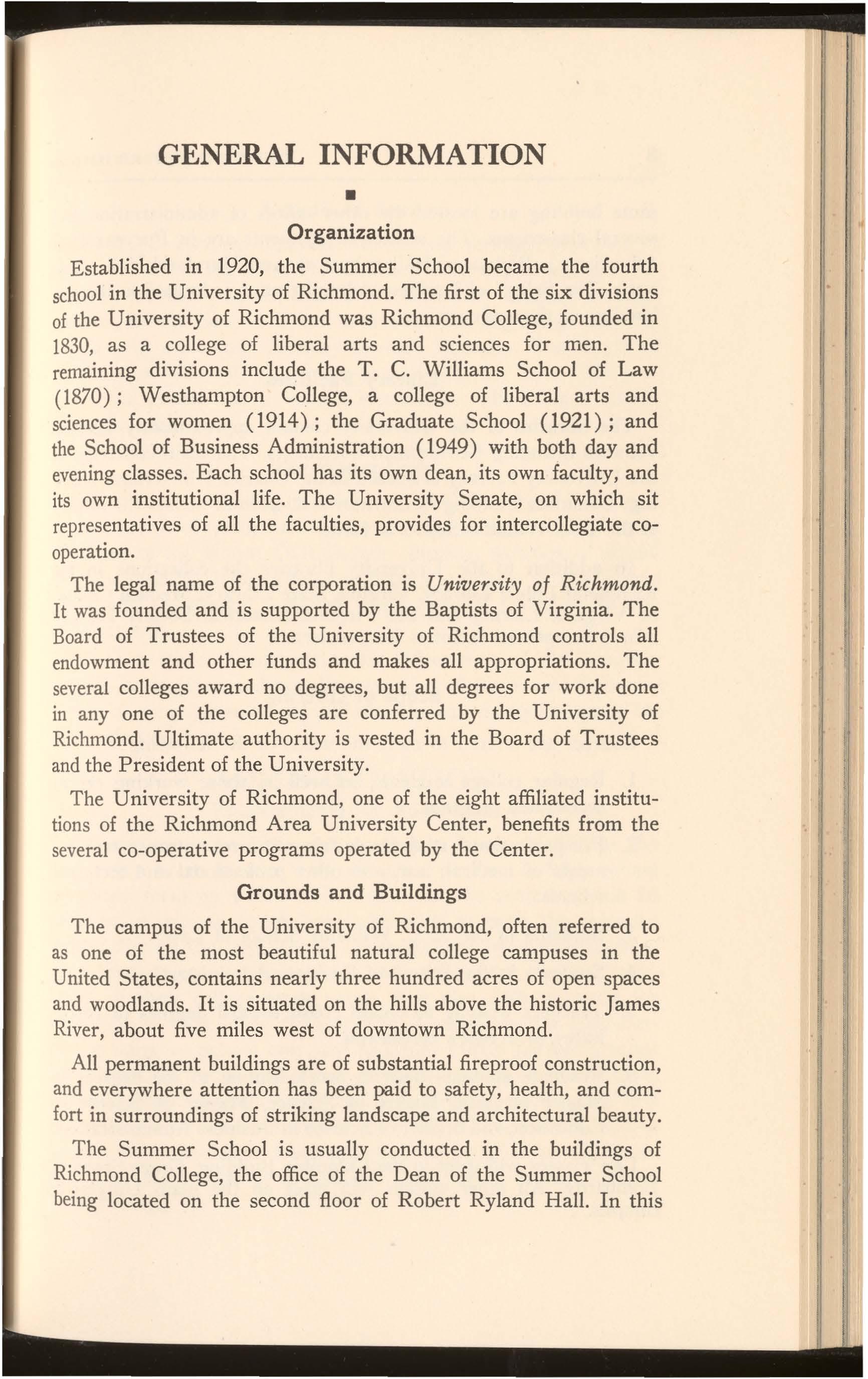 Established in 1920, the Summer School became the fourth school in the University of Richmond. The first of the six divisions of the University of Richmond was Richmond College, founded in 1830, as a college of liberal arts and sciences for men. The remaining divisions include the T. C. Williams School of Law (1870); Westhampton College, a college of liberal arts and sciences for women ( 1914) ; the Graduate School ( 1921) ; and the School of Business Administration ( 1949) with both day and evening classes. Each school has its own dean, its own faculty, and its own institutional life. The University Senate, on which sit representatives of all the faculties, provides for intercollegiate cooperation.