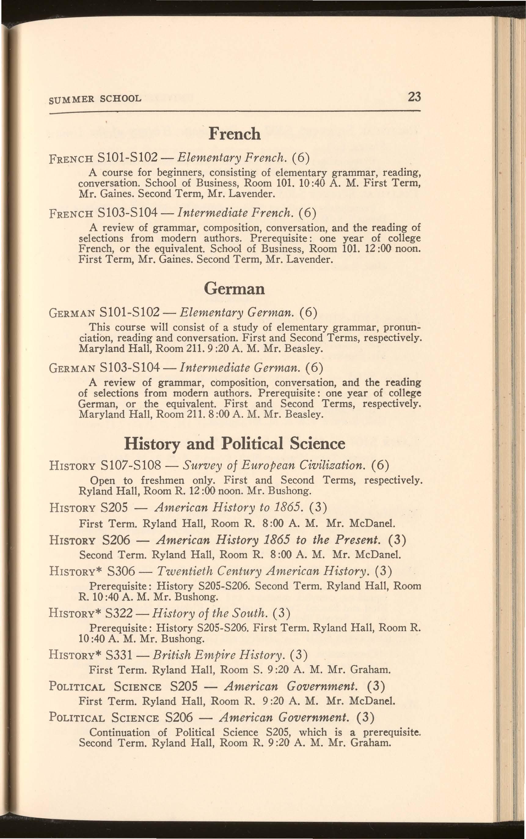 A course for beginners consisting of elementary grammar, reading, and conversation. First and Second Terms, respectively. Section (a) School of Business, Room 101. 9 :20 A. M. Mr. Caylor. Section (b) School of Business, Room 104. 12 :00 noon. Mr. Caylor.