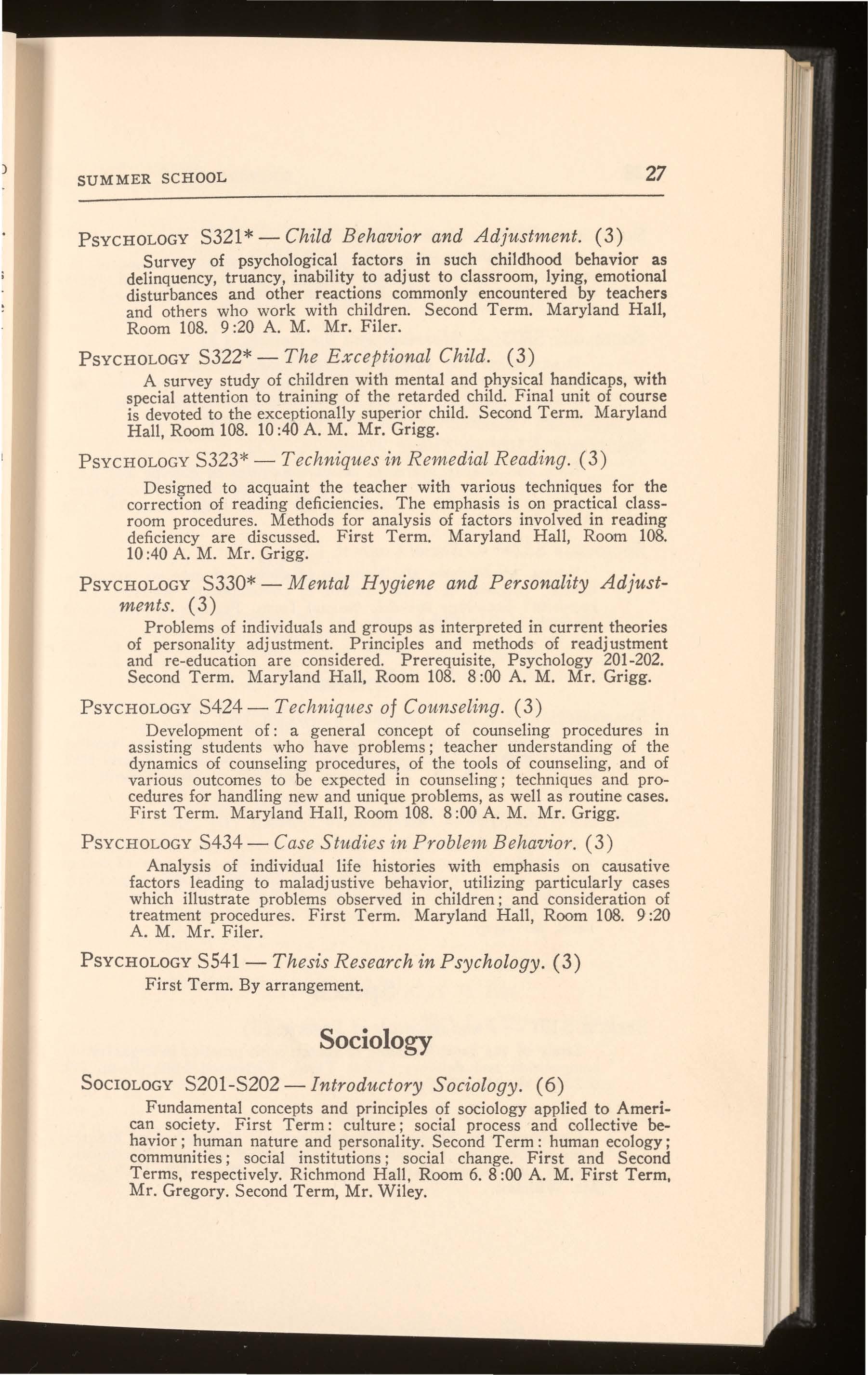 Problems of individuals and groups as interpreted in current theories of personality adjustment Principles and methods of readjustment and re-education are considered. Prerequisite, Psychology 201-202. Second Term. Maryland Hall, Room 108. 8 :00 A. M. Mr. Grigg.