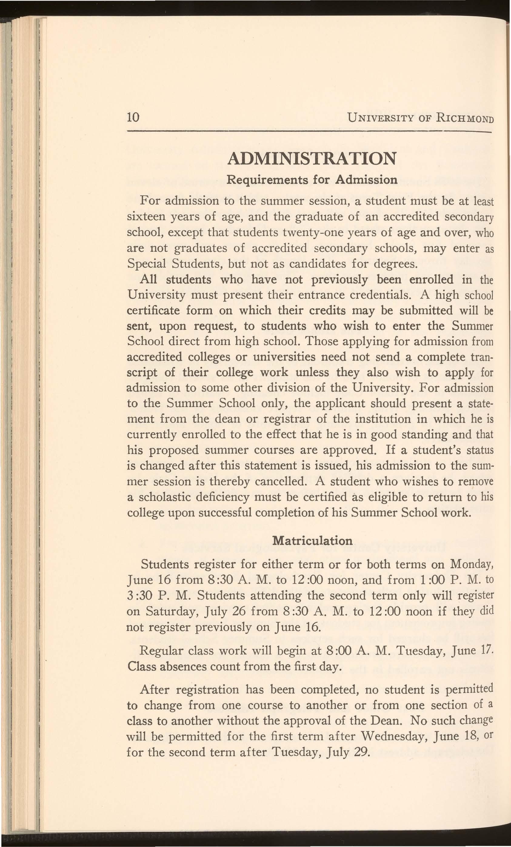 The Summer Session is open to students who are in good standing in an accredited law school where they have completed at least one year's study. Full subsistence will be allowed World War II veterans by Veterans Administration if they pursue six semester hours in one term or twelve semester hours in both terms.