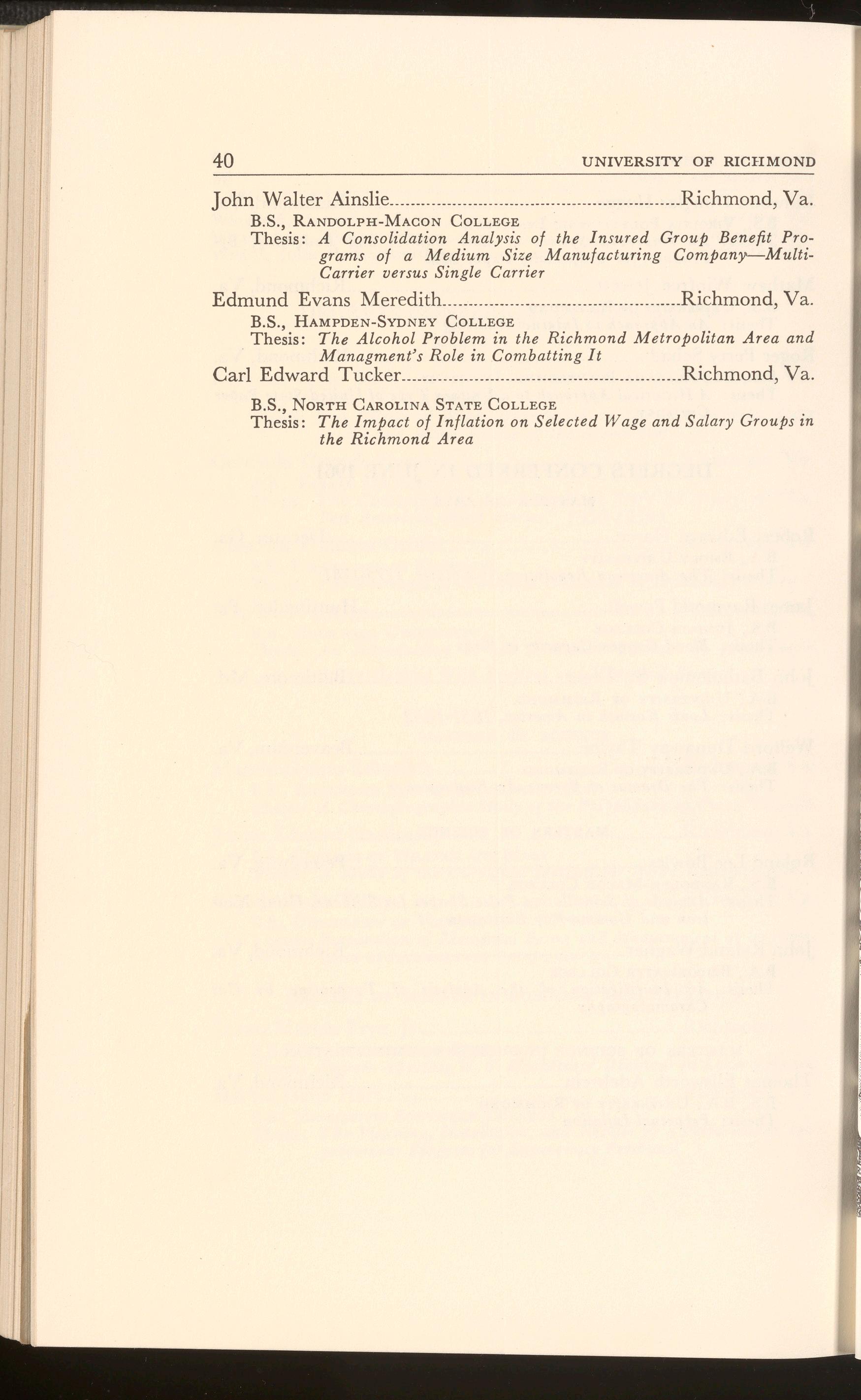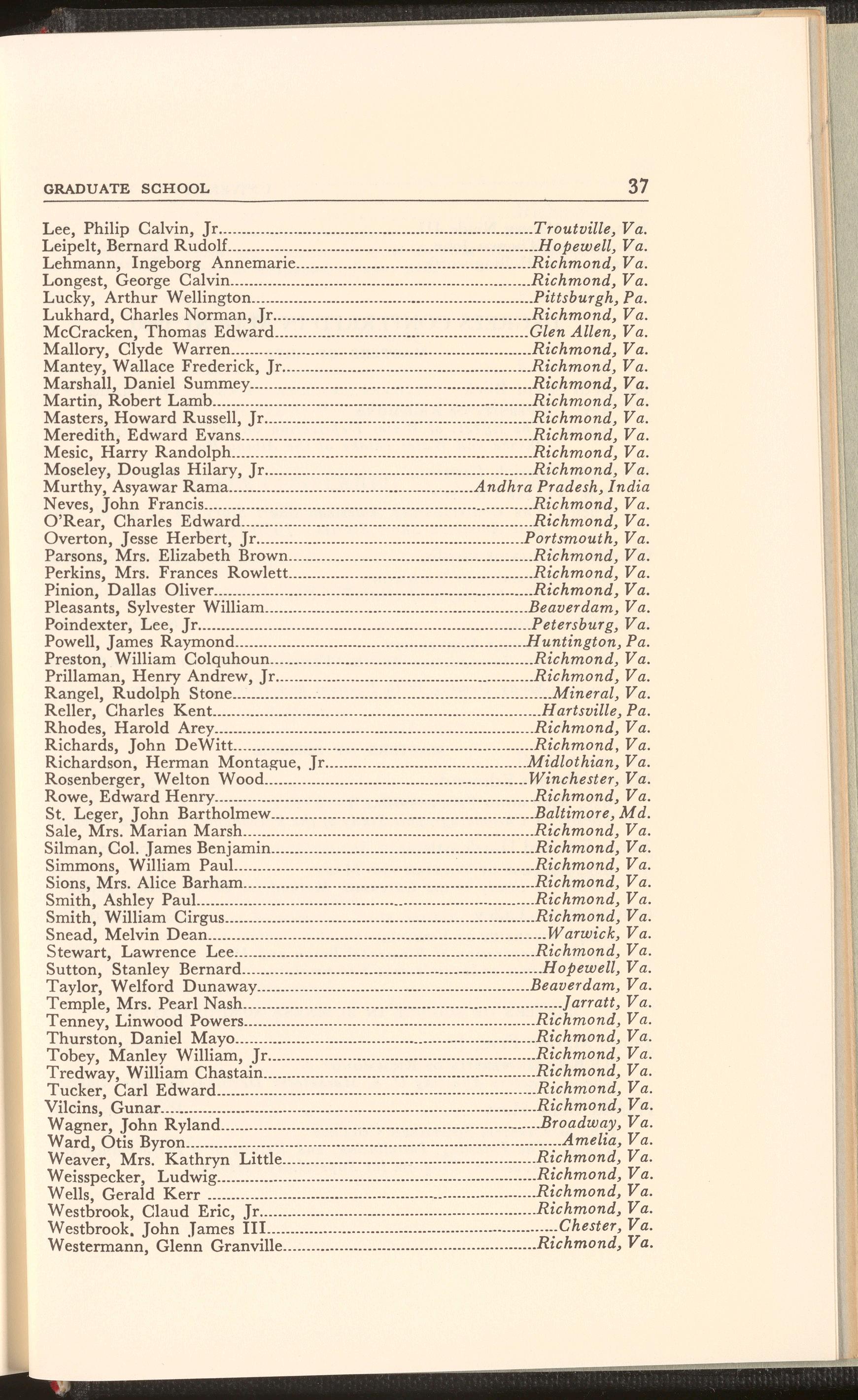 Richards, John DeWitt ................................................................ Richmond, Va. Richardson, Herman Montague, Jr...........................................Midlothian, Va. Rosenberger, Welton Wood ........................................................ Winchester, Va. Rowe, Edward Henry Richmond, Va. St. Leger, John Bartholmew ........................................................ Baltimore, Md. Sale, Mrs. Marian Marsh ...................................................... Richmond, Va. Silman, Col. .James Benjamin ........................................................ Richmond, Va. Simmons, William Paul.. .............................................................. Richmond, Va. Sions, Mrs. Alice Barham .............................................................. Richmond, Va. Smith, Ashley Paul.. ...................................................................... Richmond, Va. Smith, William Cirgus .................................................................. Richmond, Va. Snead, Melvin Dean ........................................................................ Warwick, Va. Stewart, Lawrence Lee ................................................................ Richmond, Va. Sutton, Stanley Bernard .......................... H opewell, Va. Taylor, Welford Dunaway .......................................................... Beaverdam, Va. Temple, Mrs. Pearl Nash ................ ................................................... .]arratt, Va. Tenney, Linwood Powers .............................................................. Richmond, Va. Thurston, Daniel Mayo Richmond, Va. Tobey, Manley William, Jr.........................................................Richmond, Va. Tredway, William Chastain Richmond, Va.