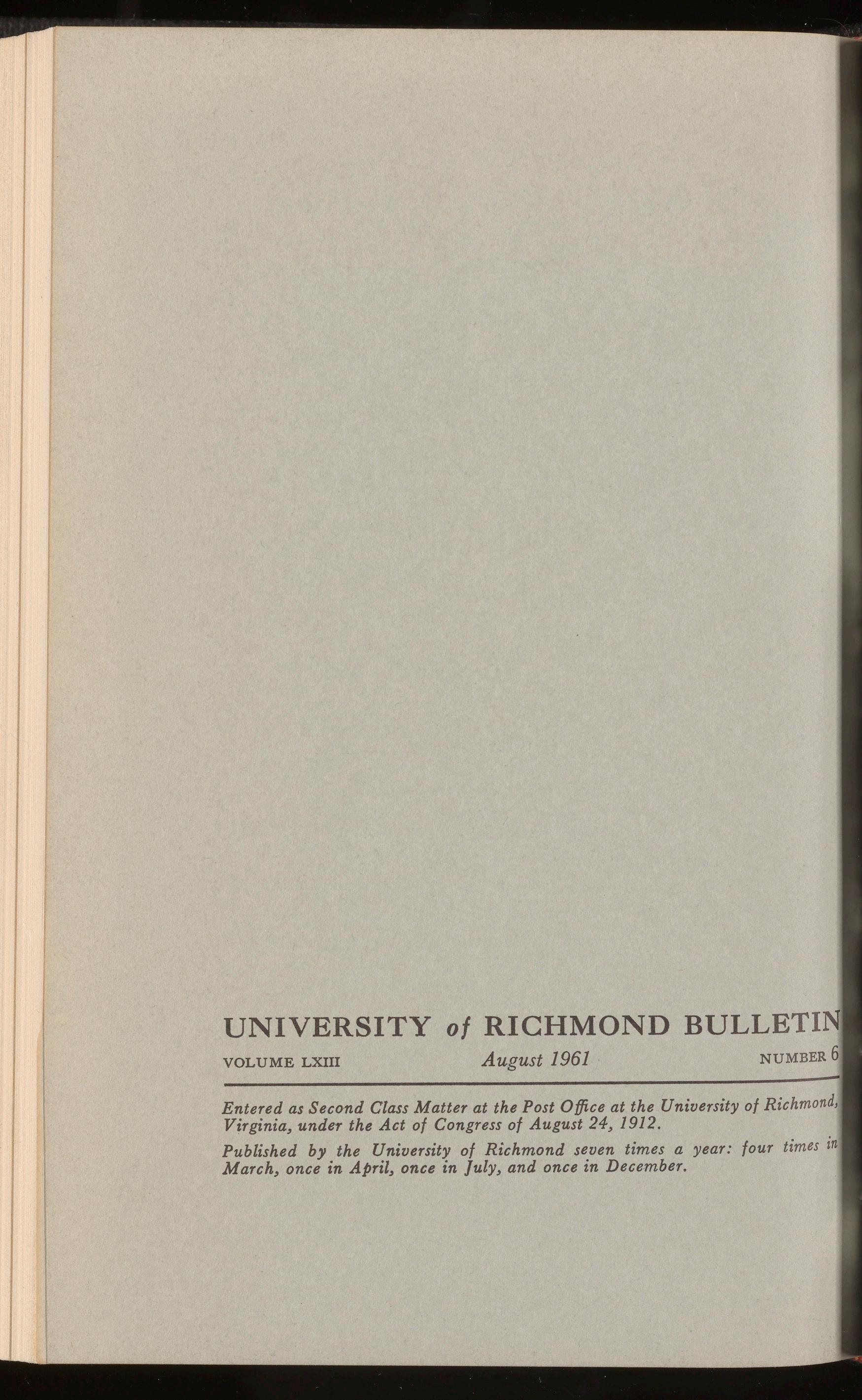 Published by the University of Richmond seven times a year: four times in March, once in April, once in July, and once in December.