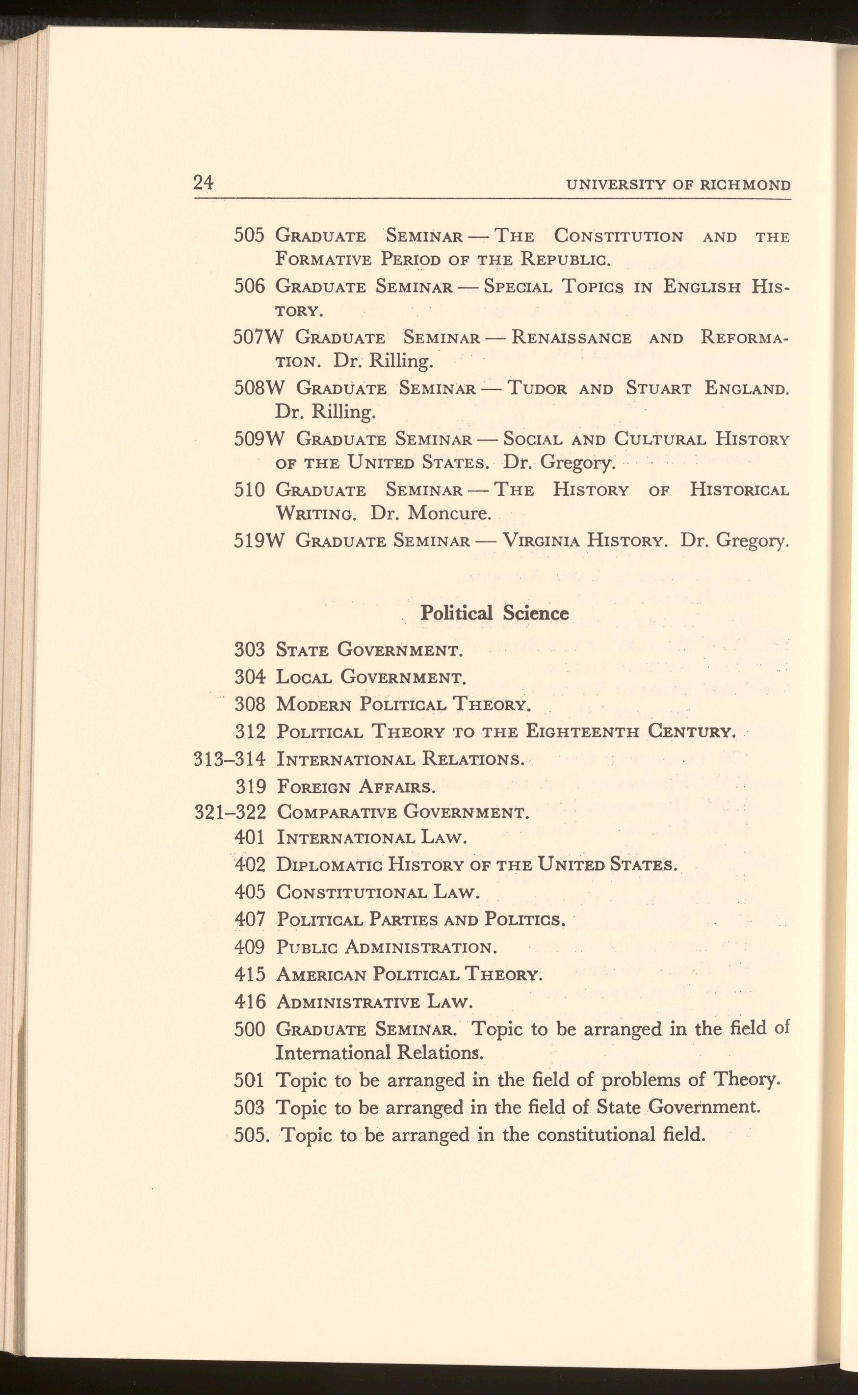 The University of Richmond is in a locality that affords unusual opportunities for research in certain fields. For example, a student of history in the city of Richmond has access to a wealth of source materials nowhere else to be found. Similar opportunities are offered to a student of government. Furthermore, the rapid industrial growth of the city and the surrounding territory has brought within the reach of the University industrial plants in great number and variety, which demand the increasing application of science.
