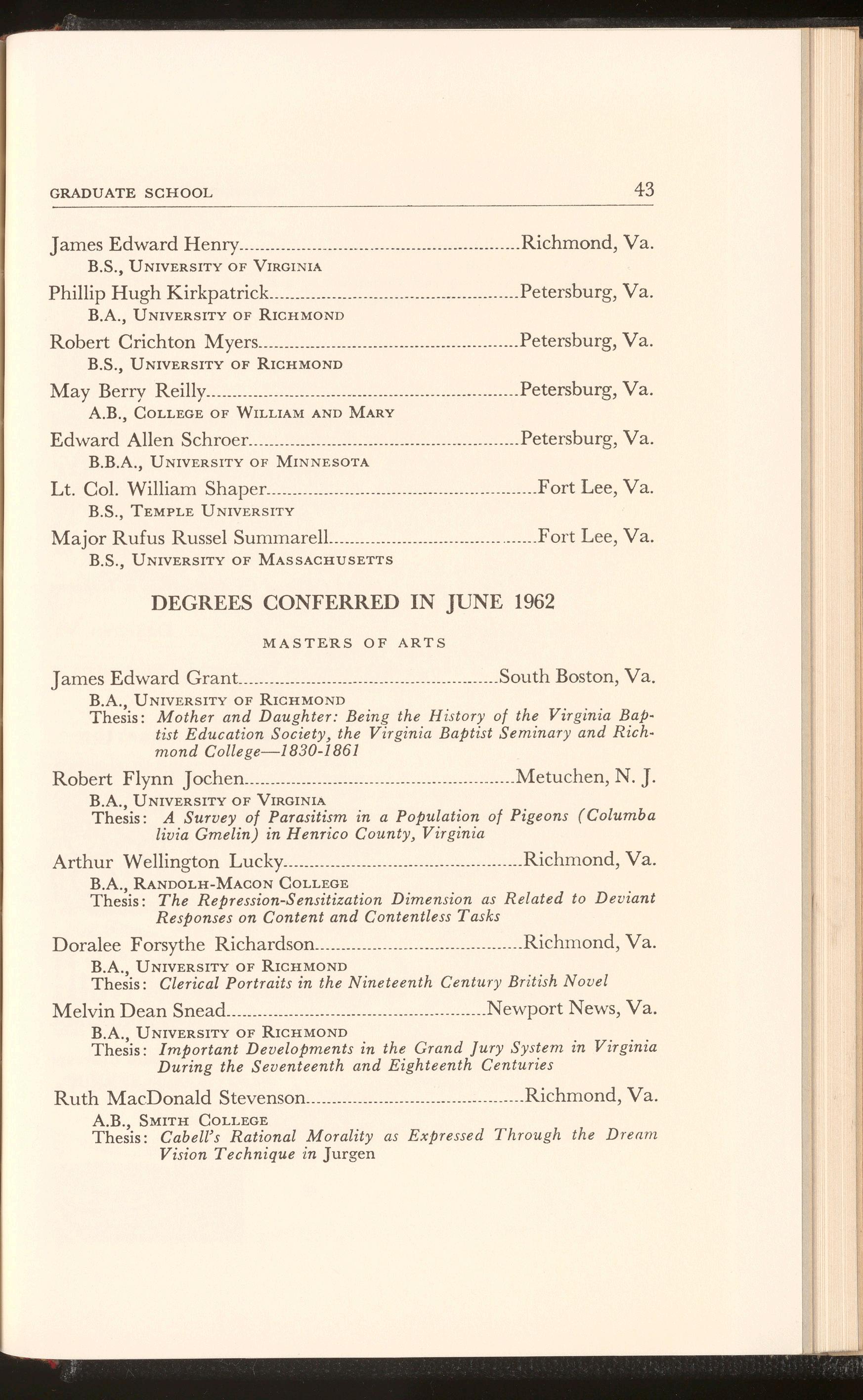 Taylor, Gerald Reed, Jr ................. Bloxom, Va. Tenney, Linwood Powers ..................... Richmond, Va. Towler, Joseph ....................... ...................... Richmond, Va. Trimble, Margot Cushing .... ....................................................... Richmond, Va. Vilcins, Gunars ......... ..................................................................... Richmond, Va. Wawner, Franklin Edward, Jr .......................................... Hopewell, Va. Weissbecker, Ludwig ............................................. Richmond, Va. Westbrook, John James, 111.. ..... ........................... Chester, Va. Wingfield, Harvey Ninde, III.. .................................................. Glen Allen, Va. Woods, Harry Pollard ........ Richmond, Va. Wright, Allen Kent ...................................................................... Richmond, Va. Zizos, Andreas Peter ....................................................... Richmond, Va. Zoretic, Phillip .............. ............................................................... Richmond, Va.