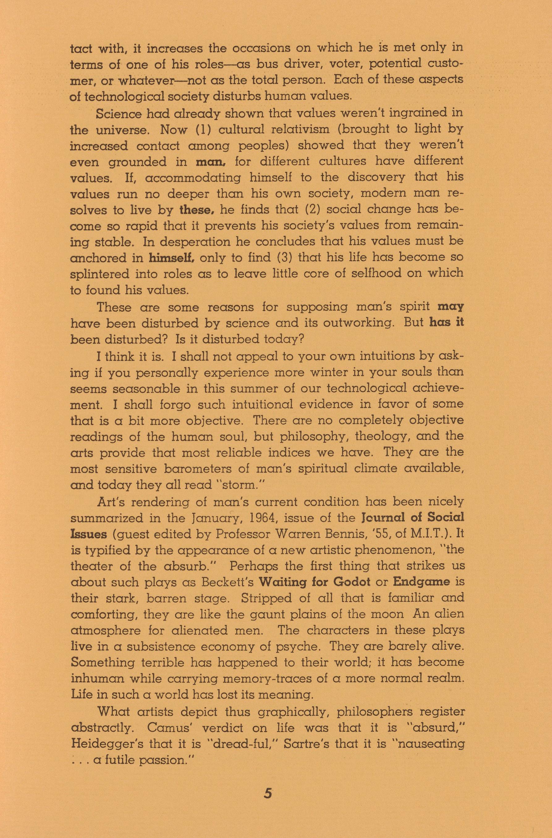 In one moment he would suddenly recall a partial phrase, in the next he could find himself looking out the window. He knew no time He felt no movement. He tried to calculate not at all. He sloshed and motivated . He wondered and hoped. He related and promptly remembered a dictionary of useless facts . He knew not where he was. In his head he must have read the solution before He had taken in so many words. Some combination of them must have some clue for him? There must be some cong lomeration of words, no matter how foolish, that would suit him The vestments of conformity and maturity fell from him, and he was stripped to naked embarrassment. He did not know what to do with himself . He did not want to dress now. He could not dress ever , he knew now There was no safety behind fashion . There was no protection in the calming balms of primary needs . He m ust decide what he was now. Was it true that man, devoid