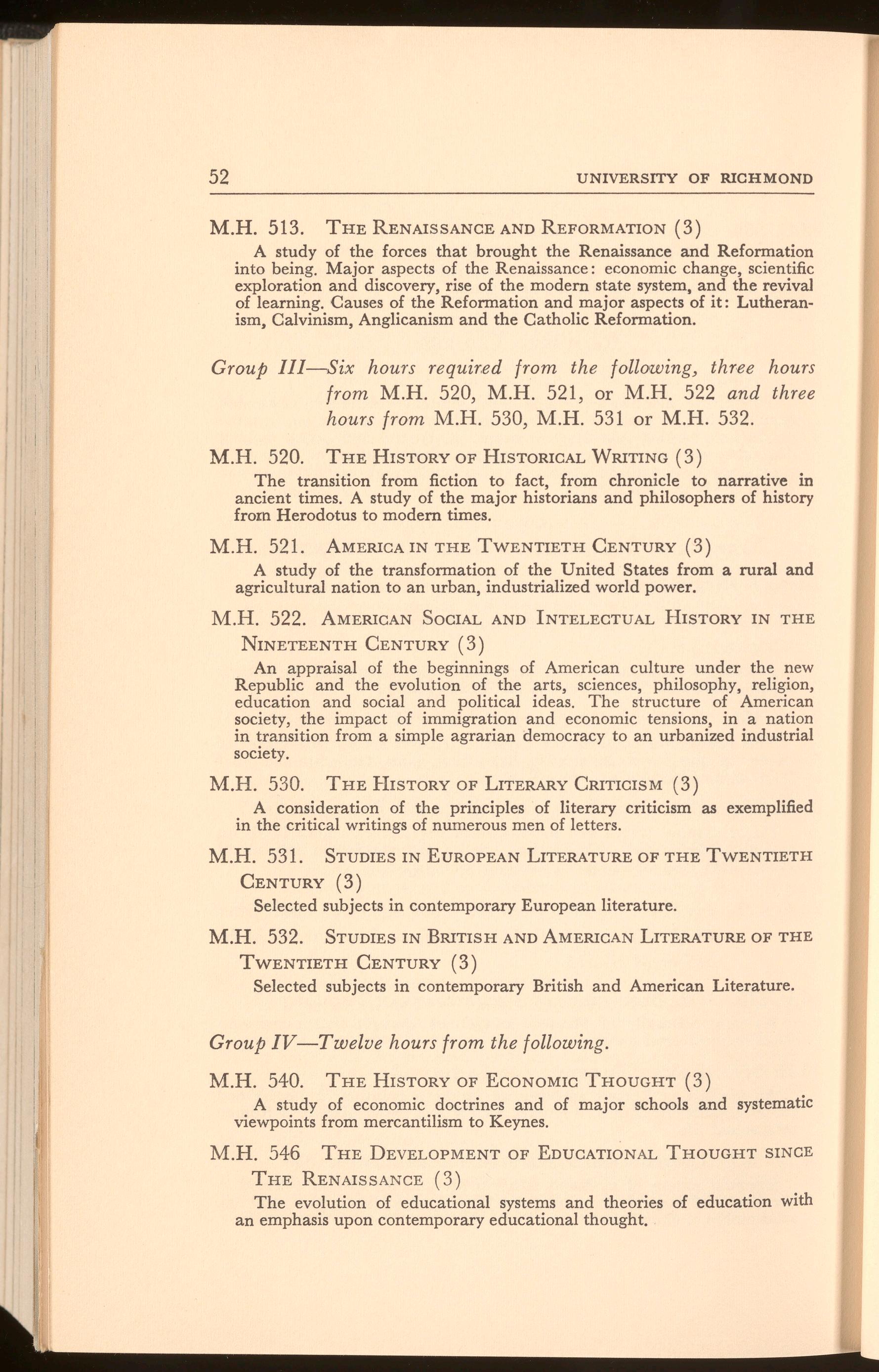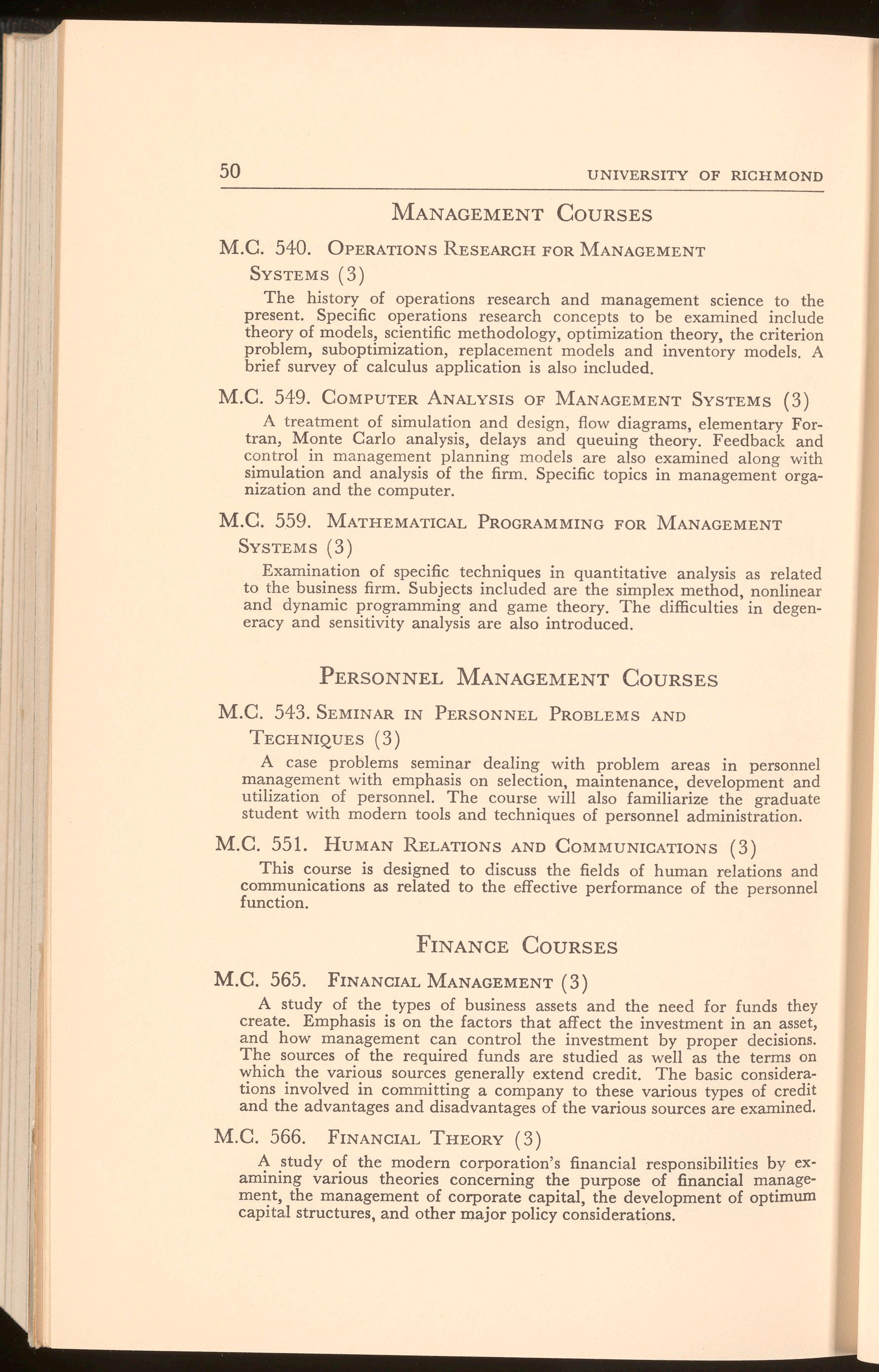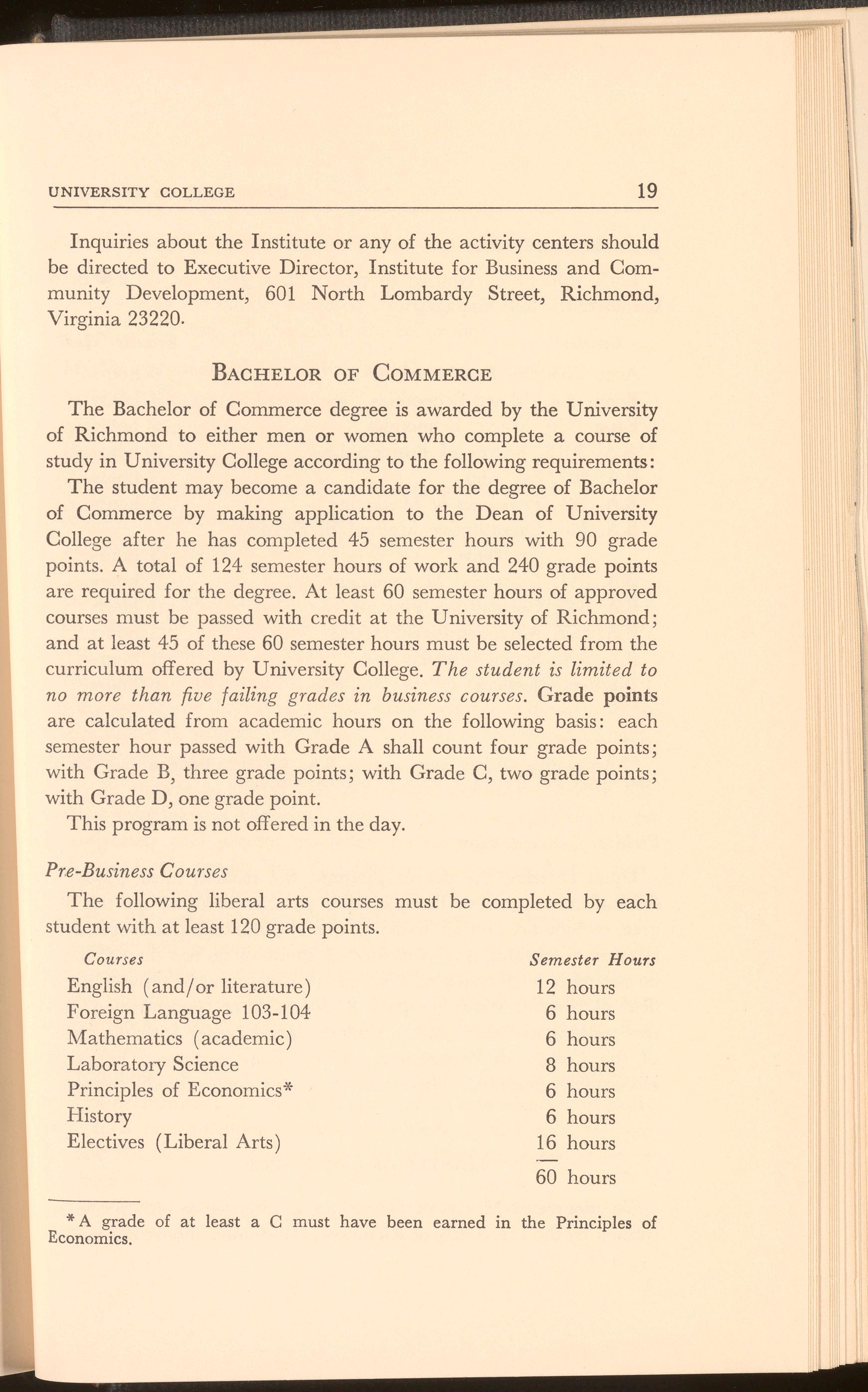 The University of Richmond, one of the twenty-four affiliated institutions of the University Center in Virginia, benefits from the several cooperative programs operated by the Center. Through a cooperative Evening Program students can complete all requirements for an Associate Award in Arts and Commerce and an Undergraduate degree in Commerce. Graduate degrees in Commerce and Humanities may be earned in the evening in University College. The Institute for Business and Community Development and the Junior College are integral parts of University College.