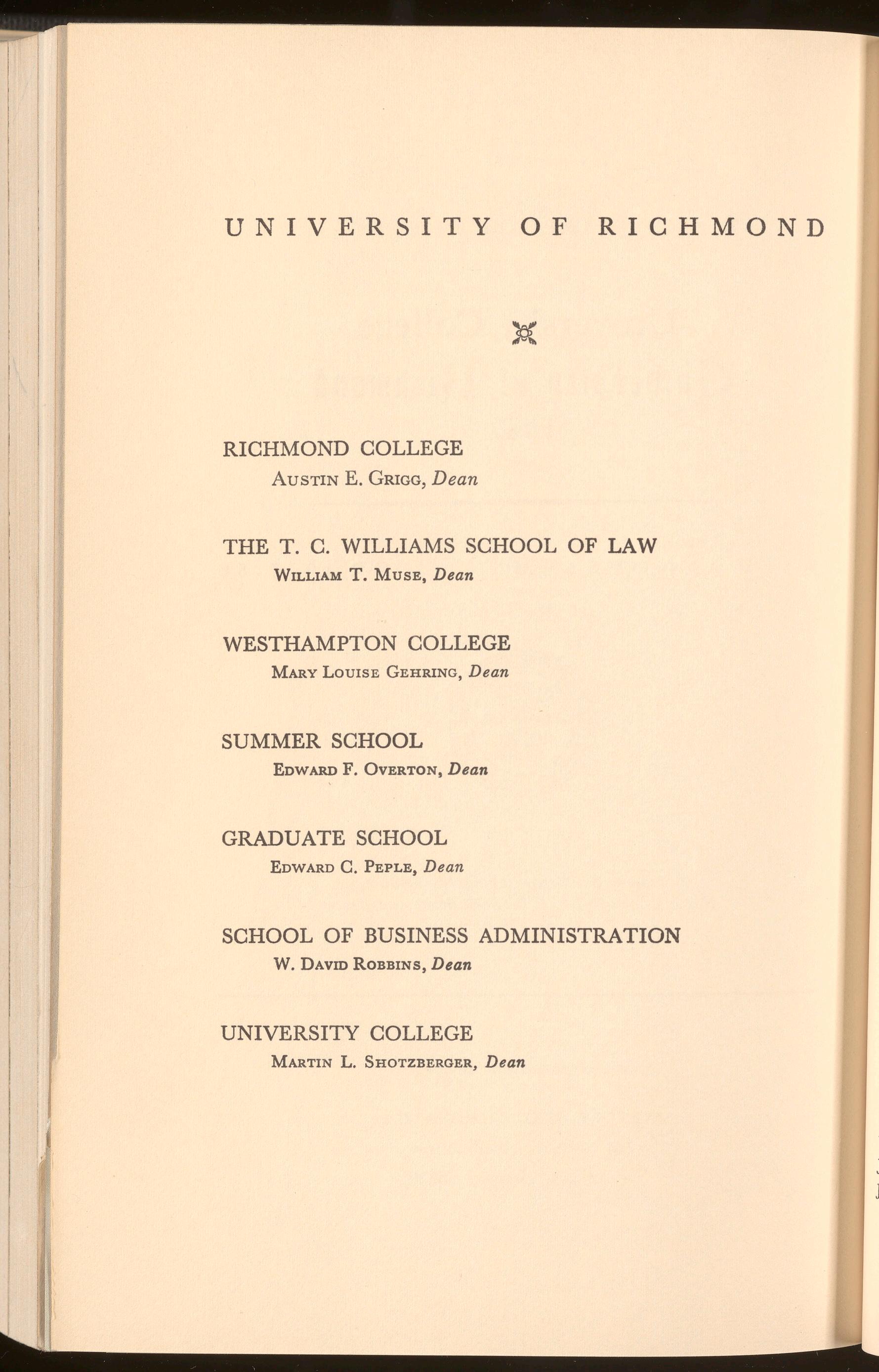 The University of Richmond was founded and is affiliated with the Baptists of Virginia. Other divisions with dates of founding are Richmond College ( 1830); The T. C. Williams School of Law (1870); Westhampton College ( 1914); the Summer School (1920); the Graduate School ( 1921) ; and the School of Business Administration ( 1949). Each College has its own dean, its own faculty, and its own institutional life. The University Senate, on which sit representatives of all the faculties, provides for intercollegiate cooperation.