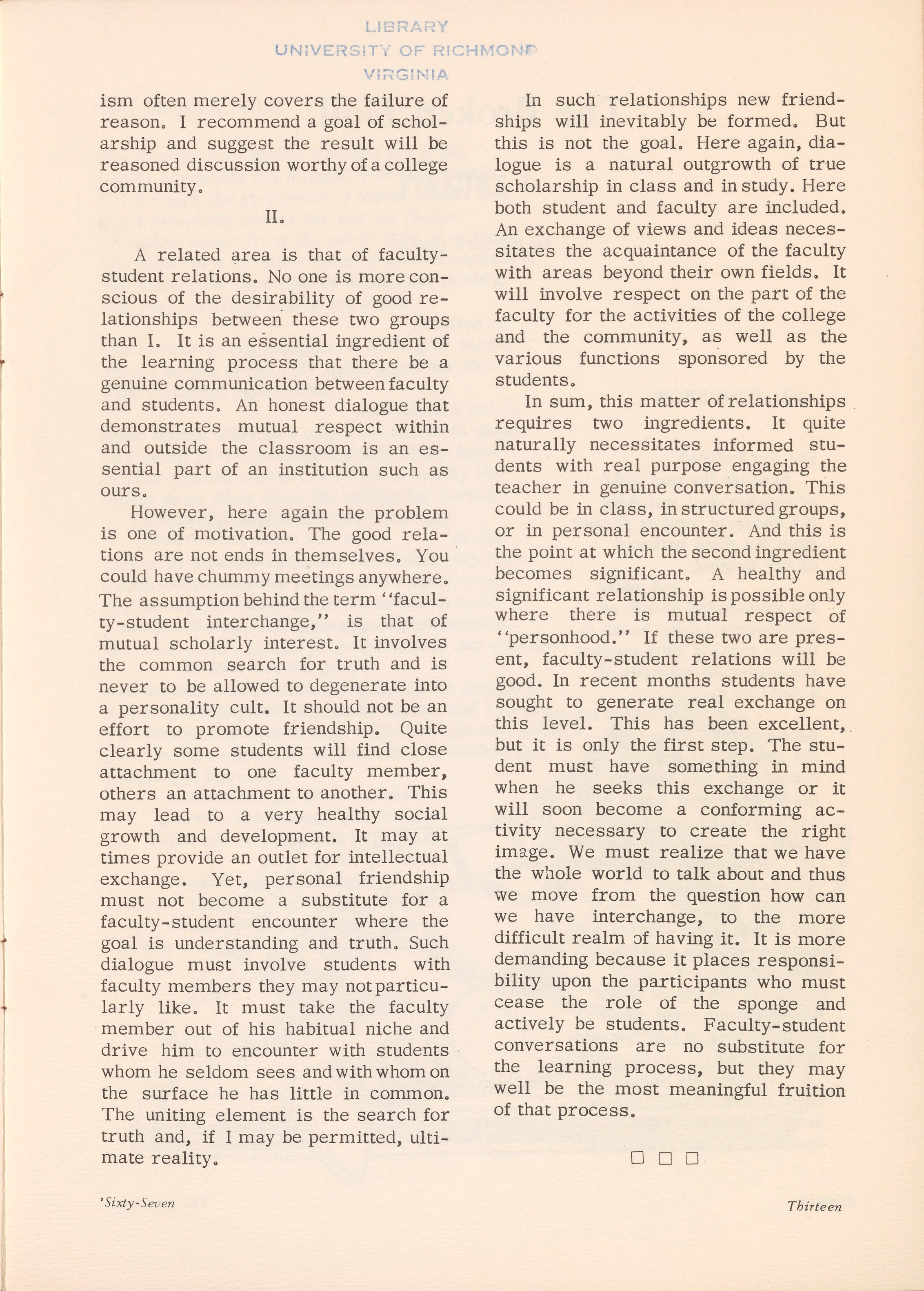 Since coming to the University of Richmond in 1963 I have been struck by many things of an encouraging nature concerning the health of the student body. In most measurable ways Richmond and Westhampton collegians are similar to their counterparts in sister institutions in the state and nation. There is genuine academic interest and a seriousness related to the pursuit of knowledge. Caught up in a new era where infromation flows forth at such a staggering rate that it often becom es difficult to determine the limits of a liberal arts education from year to year, the modern student generation has proved adaptable. It is not my opinion that students of the l 960's are more intelligent than their predecessors at the University, but they certainly have assimilated a vast store of information extending far beyond the imagination of college inhabitants only a brief fifteen years ago. Education becomes more and more an adventure into which, ideally, student and professor thrust themselves together in the unhindered search for truth. And yet it may be at this very point that regression is evident in scholarly matters.