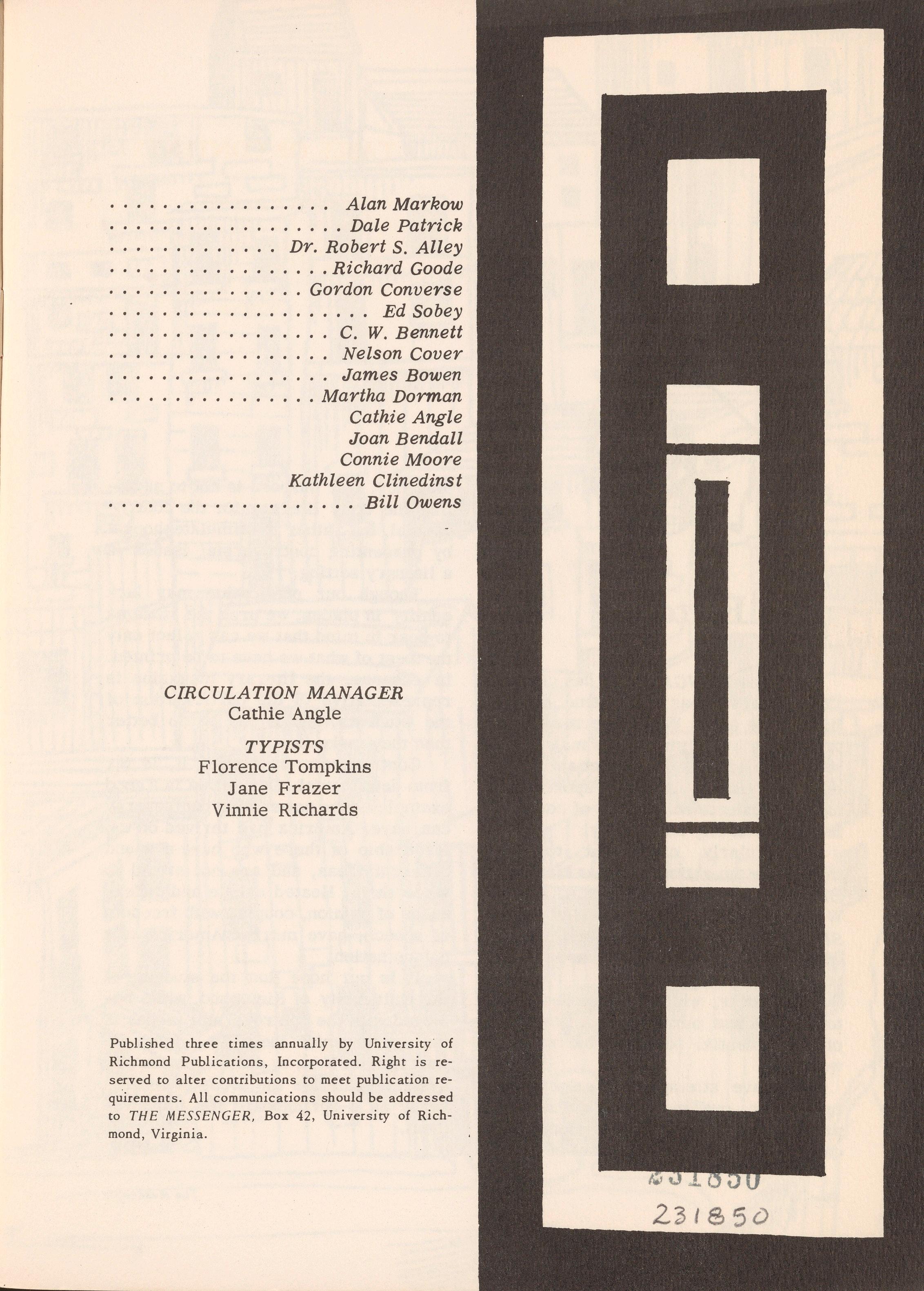 Published three times annually by University of Richmond Publications , Incorporated Right is reserved to alter contributions to meet publication req~irements. All communications should be addressed to THE MESSENGER, Box 42 , University of Richmond, Virginia