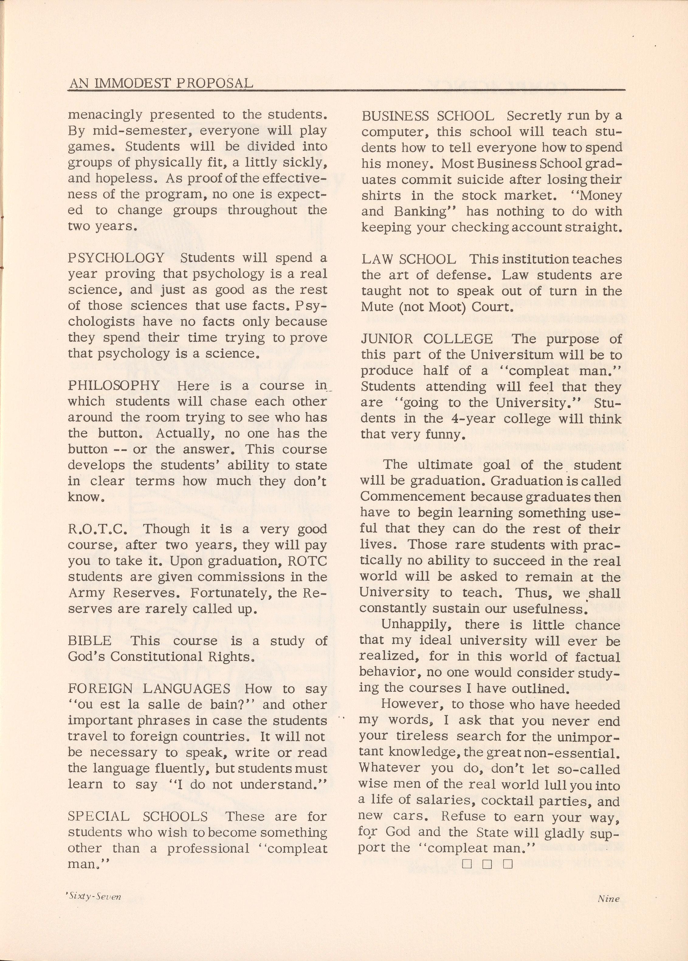 The academic life will be the main purpose of my university. Courses will be provided to create the ''compleat man" --never skilled for any true task, but always able to formulate nonessential plans in -any field. The remainder of this essay will concern itself with some of the available basic courses for, as the learned have stated, "learnum es vitae hoc dictum patria", or, books in the hands of a fool make a wise man .•••laugh.