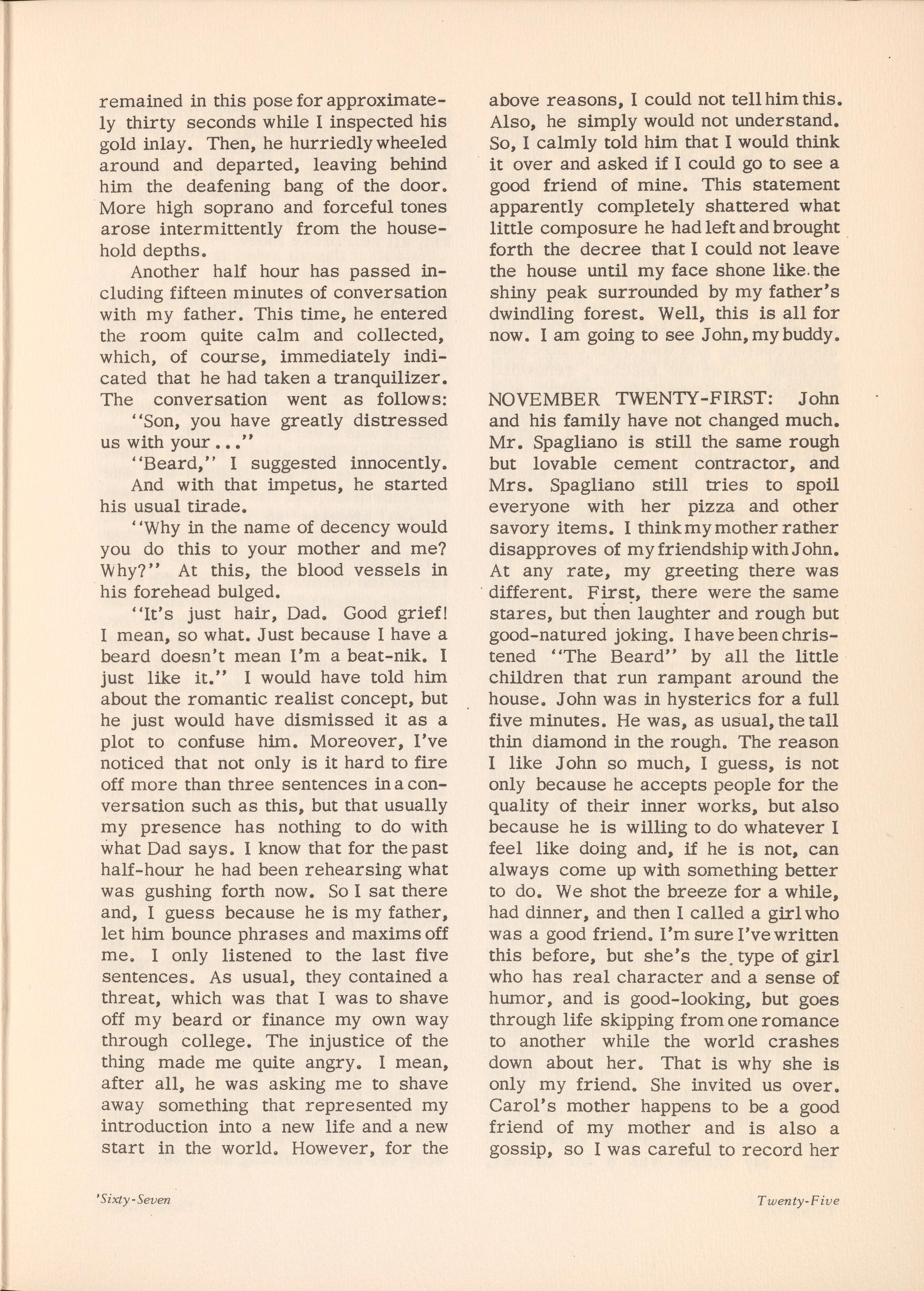 NOVEMBER TWENTY-FOURTH: Nothing much has gone on in the last couple of days, with one exception. Today, around twelve-thirty, I began to wonder what would happen at the archaic Holme Boarding School if last year's vicepresident of the school, member of the student council, and varsity letterwinner in two sports showed up sporting a two-inch beard. I sat there for about an hour thinking on the subject until the idea appealed to me so much that I just had to try it. So, I called John and told him the idea, which he liked, and he said he would pick me up in half an hour. A little while later we arrived at the school grounds, where a group of students immediately saw me. Needless to say, they thought my face was just the thing to ''fix'' some teachers, among whom one or two outlawed wrap-around dancing at a school dance because it was "practically illegal necking." As I approached the entrance, I . could easily imagine the spasms of joy that were passing from one class room to another. Unfortunately, I arrived just as lunch was over. This is the time when the elder teachers gather and tell their rather droll jokes, the young teachers get together and tell their not-so-droll jokes, and the students seek out their appropriate clique. As I walked in, a group of the older teachers spotted me. At once they emitted in unison a horrified shout, and, along with the just arriving head-