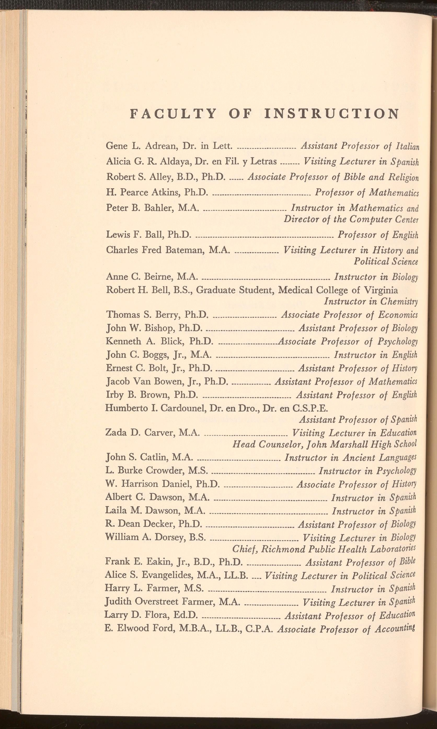 William A. Dorsey, B.S..................................... Visiting Lecturer in Biology Chief, Richmond Public Health Laboratories