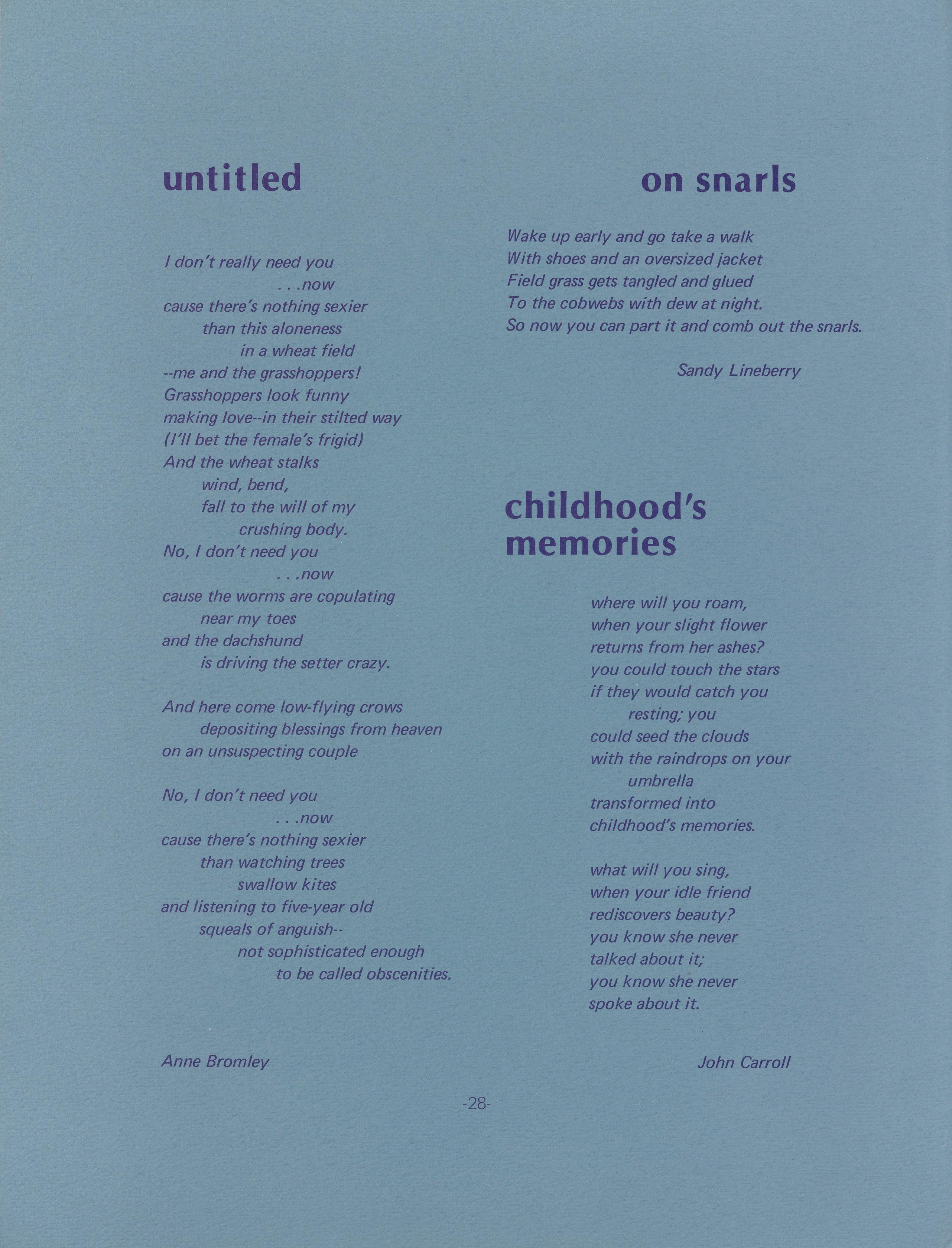 I don't really need you .. . now cause there's nothing sexier than this aloneness in a wheat field --me and the grasshoppers! Grasshoppers look funny making love--in their stilted way (I'll bet the female's frigid) And the wheat stalks wind, bend, fall to the will of my crushing body. No, I don't need you .. . now cause the worms are copulating near my toes and the dachshund is driving the setter crazy.
