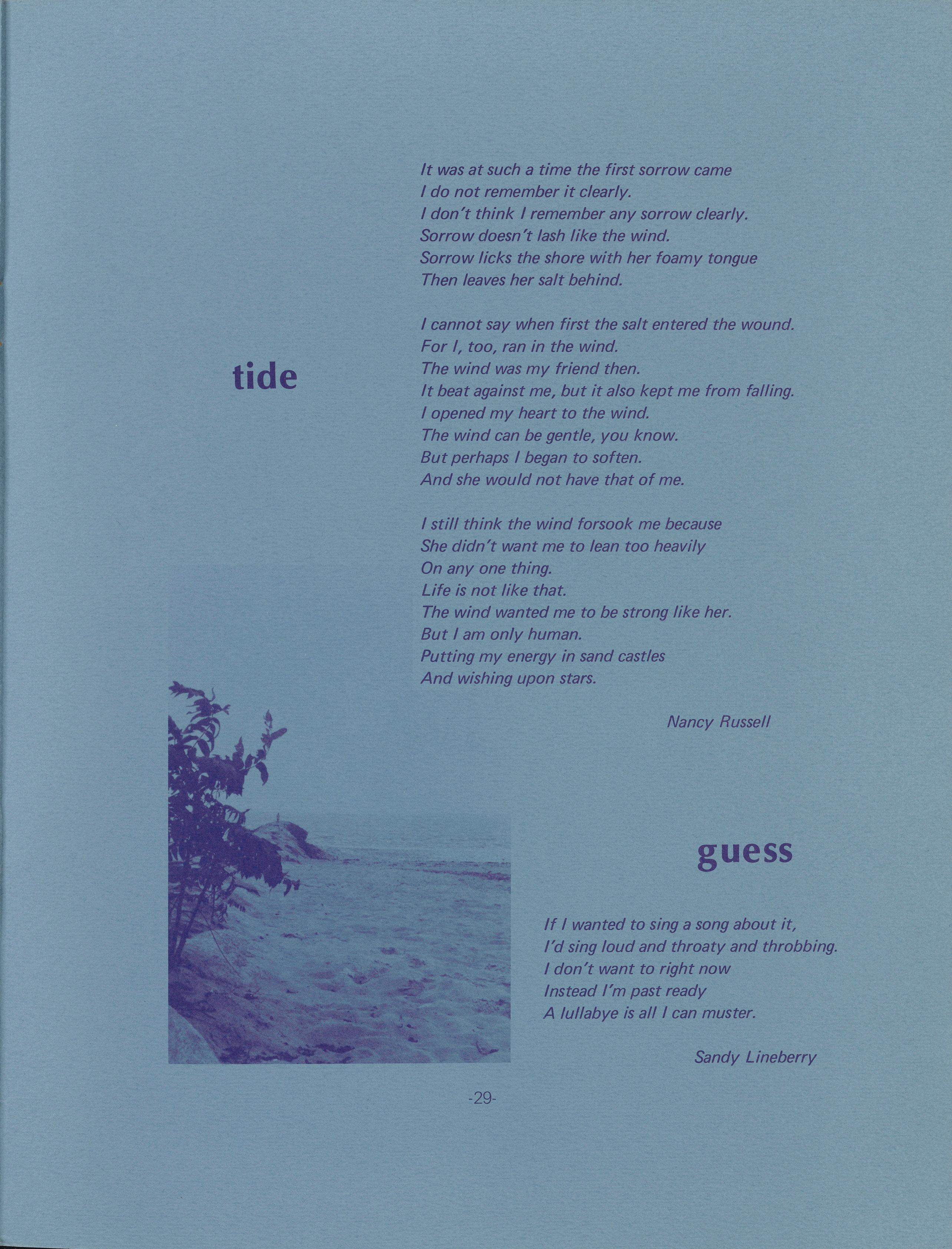trust finds itself but you are trapped, hung in one spot dangling over water, lost to one world, lost in the other you can not swim; fear the water. -30-