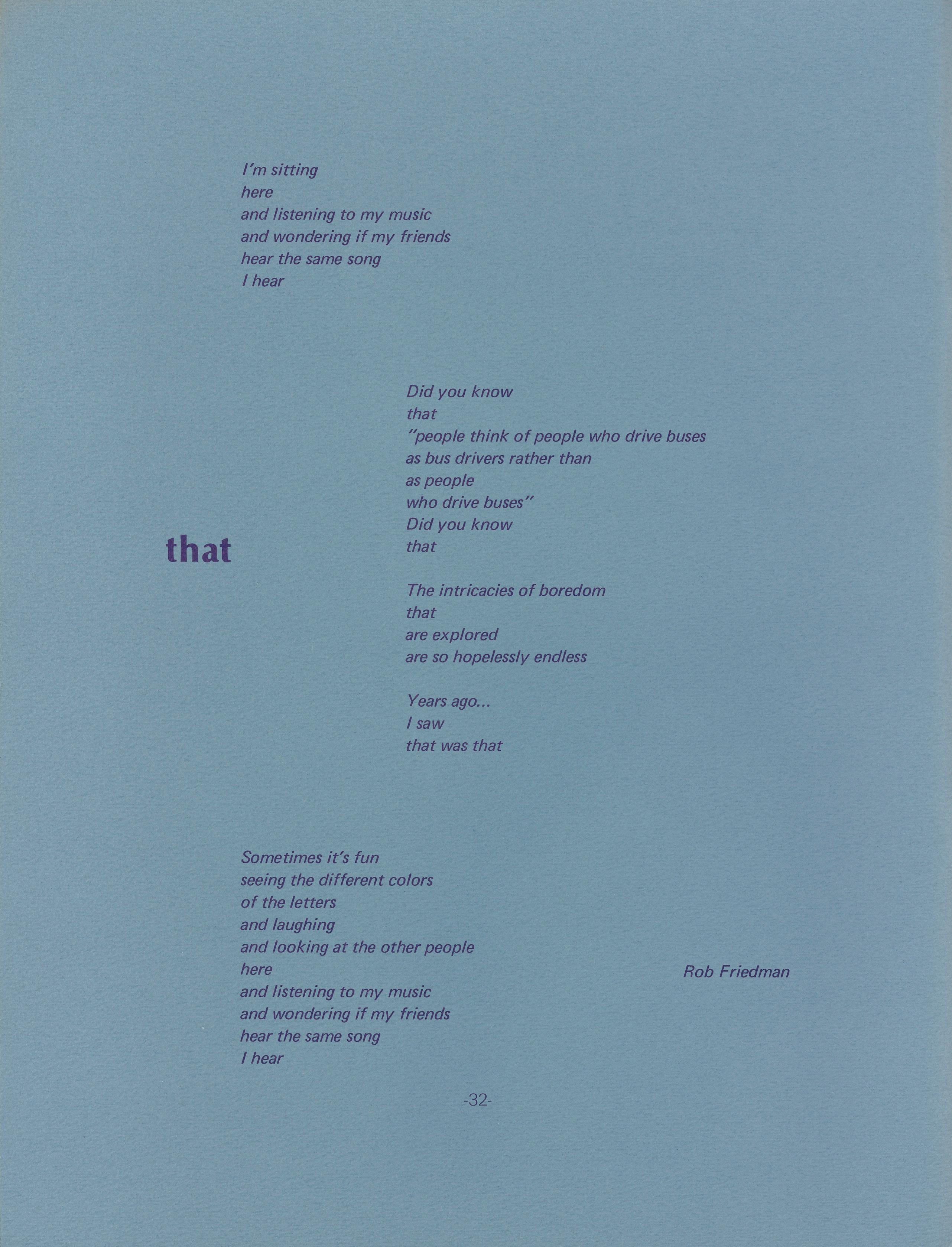 seeing the different colors of the letters and laughing and looking at the other people here and listening to my music and wondering if my friends hear the same song I hear