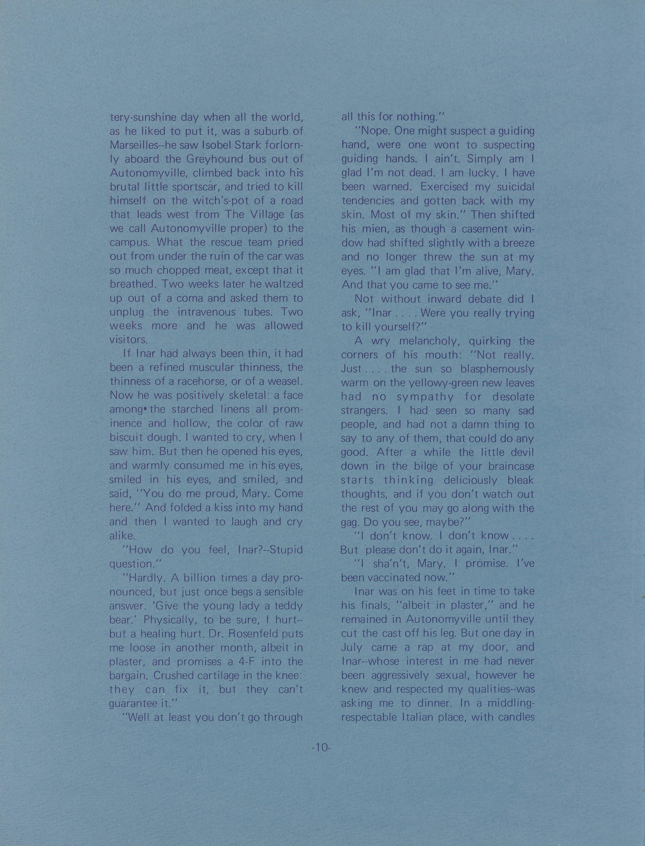 tery-sunshine day when all the world, as he liked to put it, was a suburb of Marseilles--he saw Isobel Stark forlornly aboard the Greyhound bus out of Autonomyville, climbed back into his brutal little sportscar, and tried to kill himself on the witch's-pot of a road that leads west from The Village (as we call Autonomyville proper) to the campus. What the rescue team pried out from under the ruin of the car was so much chopped meat, except that it breathed. Two weeks later he waltzed up out of a coma and asked them to unplug the intravenous tubes. Two weeks more and he was allowed visitors.