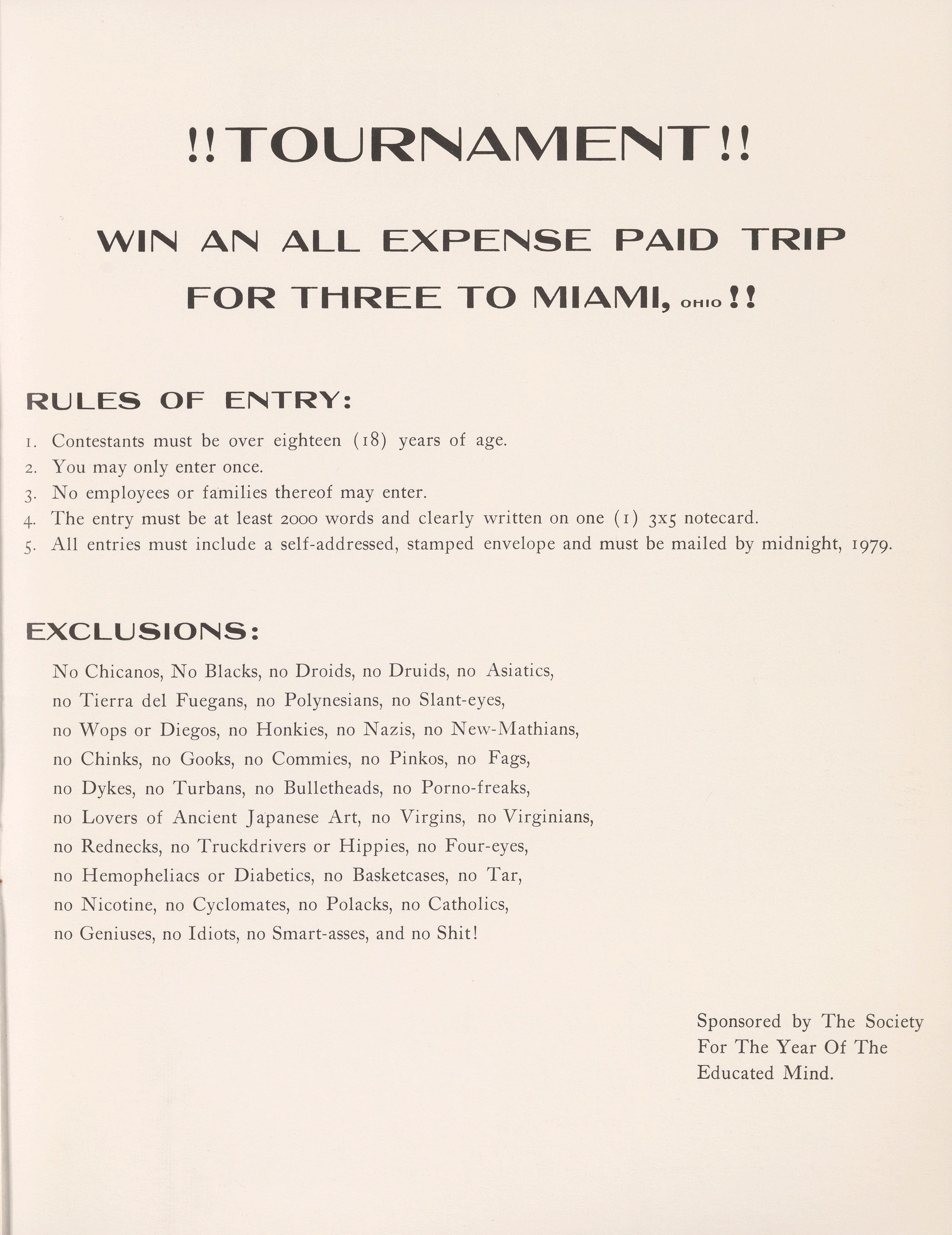 No Chicanos, No Blacks, no Droids, no Druids, no Asiatics, no Tierra del Fuegans, no Polynesians, no Slant-eyes, no Wops or Diegos, no Honkies, no Nazis, no New-Mathians, no Chinks, no Gooks, no Commies, no Pinkos, no Fags, no Dykes, no Turbans, no Bulletheads, no Porno-freaks, no Lovers of Ancient Japanese Art, no Virgins, no Virginians, no Rednecks, no Truckdrivers or Hippies, no Four-eyes, no Hemopheliacs or Diabetics, no Basketcases, no Tar, no Nicotine, no Cyclomates, no Polacks, no Catholics, no Geniuses, no Idiots, no Smart-asses, and no Shit!