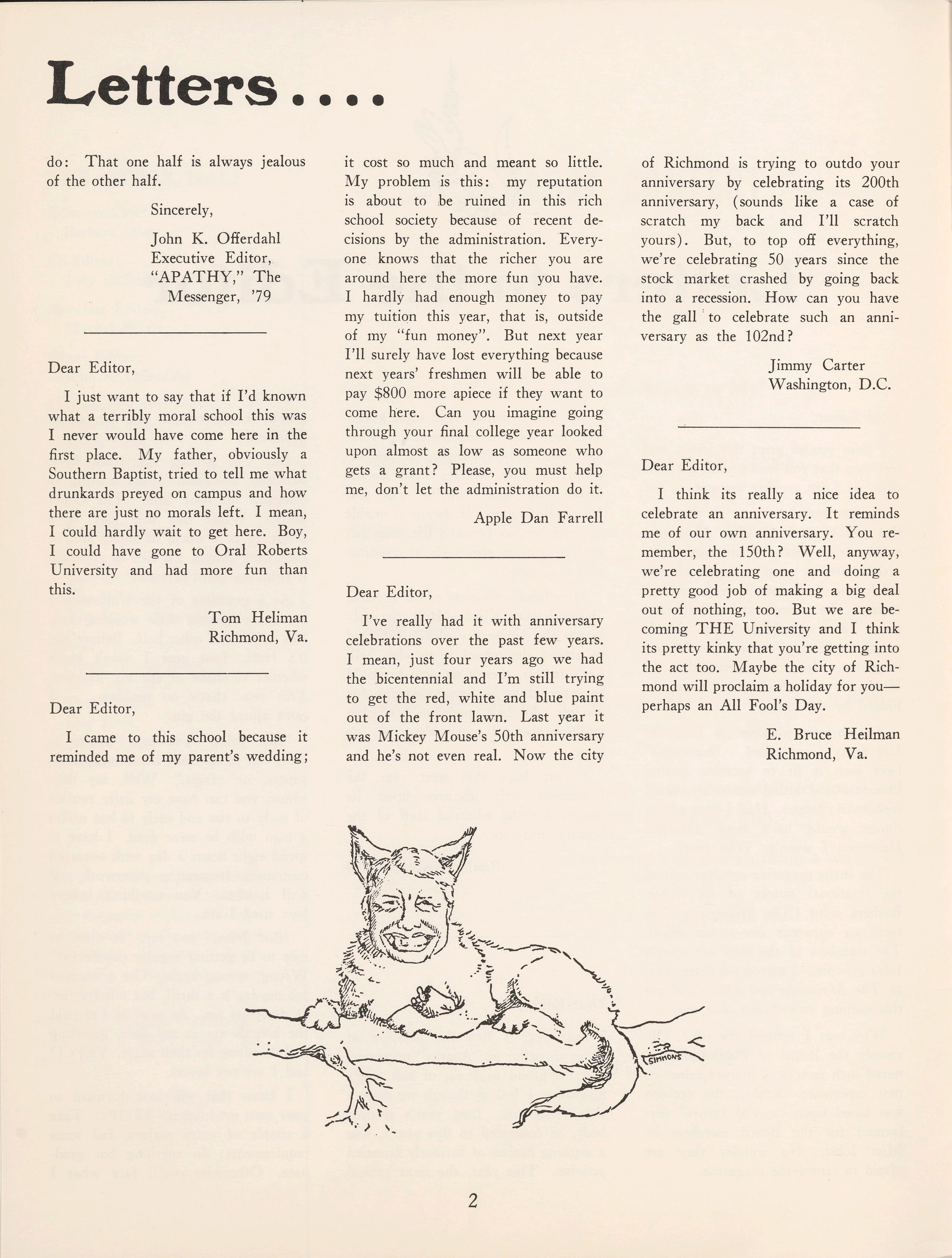 I think its really a mce idea to celebrate an anniversary. It reminds me of our own anniversary. You remember, the 150th? Well, anyway , we're celebrating one and doing a pretty good job of making a big deal out of nothing, too. But we are becoming THE University and I think its pretty kinky that you're getting into the act too. Maybe the city of Richmond will proclaim a holiday for youperhaps an All Fool's Day.