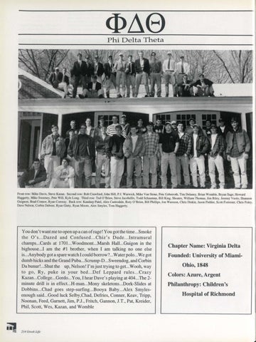 You don't want me to open up a can of rage! You got the time ...Smoke the O's ... Dazed and Confused ... Chiz's Dude .. .Intramural champs ...Cards at 1701...Woodmont...Marsh Hall ...Guigon in the bighouse .. .l am the #1 brother, when I am talking no one else is ...Anybody got a spare watch I could borrow? ...Water polo ...We got dumb hicks and the Grand Puba ...Scrump-D ...Sweendog, and Corbin Da bunur!. ..Shut the up, Nelson! I'm just trying to get. ..Wooh, way to go, Ry , puke in your bed ... Def Leppard rules ... Crazy Kazan ...College ...Gordo ...You, I hear Dave's playing at 404 ...The 2minute drill is in effect.. .H-man ...Mony skeletons ...Dork-Slides at Dobbins ... Chad goes step-surfing ...Booya Baby ...Alex Smylesenougb said ...Good luck Selby,Chad , Defries, Conner , Keav, Tripp , Noonan, Feed, Garnett, Jim, P.J., Fritch, Gannon, J.T., Pat, Kreider, Phil, Scott. Wes, Kazan, and Womble