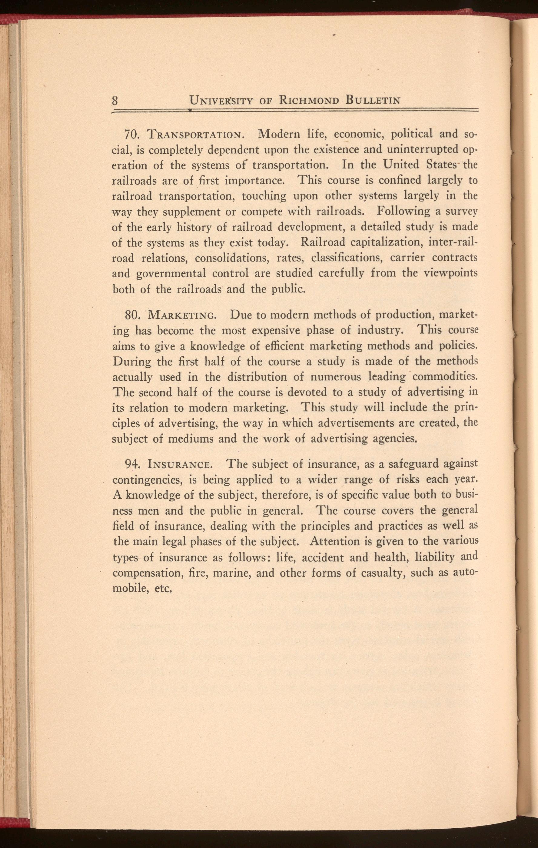 70. TRANSPORTATION. Modern life, economic, political and social, is completely dependent upon the existence and uninterrupted operation of the systems of transportation. In the United States - the railroads are of first importance. This course is confined largely to railroad transportation, touching upon other systems largely in the way they supplement or compete with railroads. Following a survey of the early history of railroad development, a detailed study is made of the systems as they exist today. Railroad capitalization, inter-railroad relations, consolidations, rates, classifications, carrier contracts and governmental control are studied carefully from the viewpoints both of the railroads and the public.