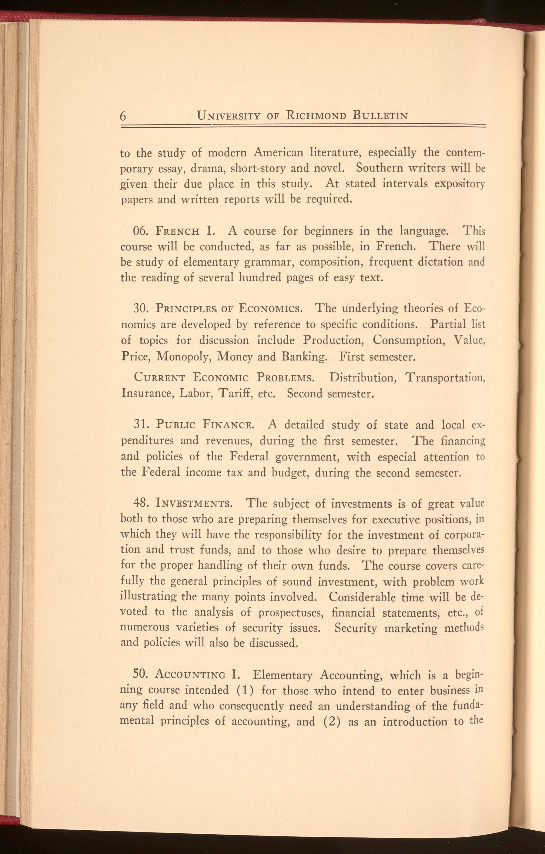 48. INVESTMENTS. The subject of investments is of great value both to those who are preparing themselves for executive positions, in which they will have the responsibility for the investment of corporation and trust funds, and to those who desire to prepare themselves for the proper handling of their own funds. The course covers carefully the general principles of sound investment, with problem work illustrating the many points involved. Considerable time will be devoted to the analysis of prospectuses, financial statements, etc., of numerous varieties of security issues. Security marketing methods and policies will also be discussed.