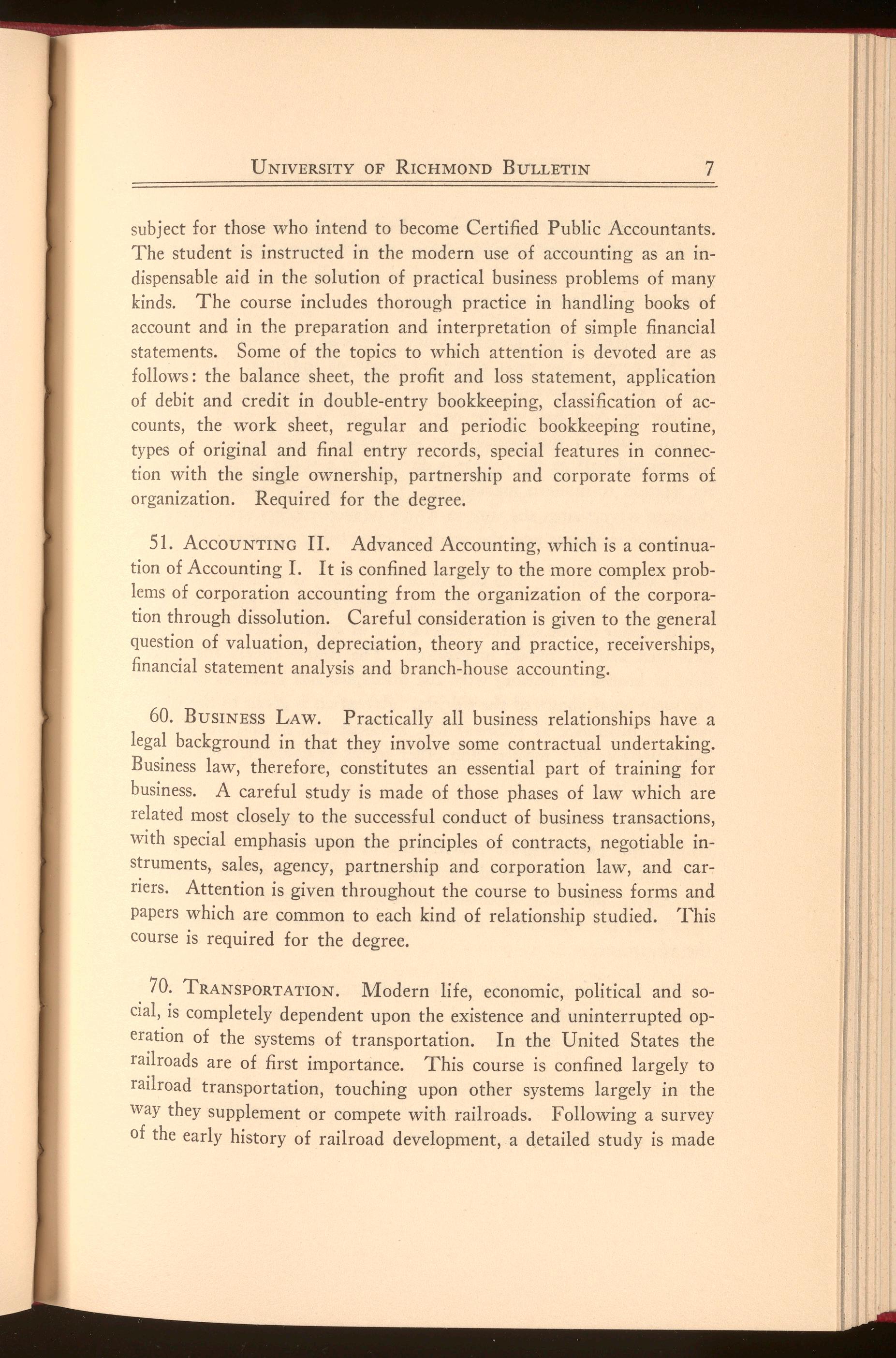 51. AccouNTING II. Advanced Accounting, which is a continuation of Accounting I. It is confined largely to the more complex problems of corporation accounting from the organization of the corporation through dissolution. Careful consideration is given to the general question of valuation, depreciation, theory and practice, receiverships, financial statement analysis and branch-house accounting.