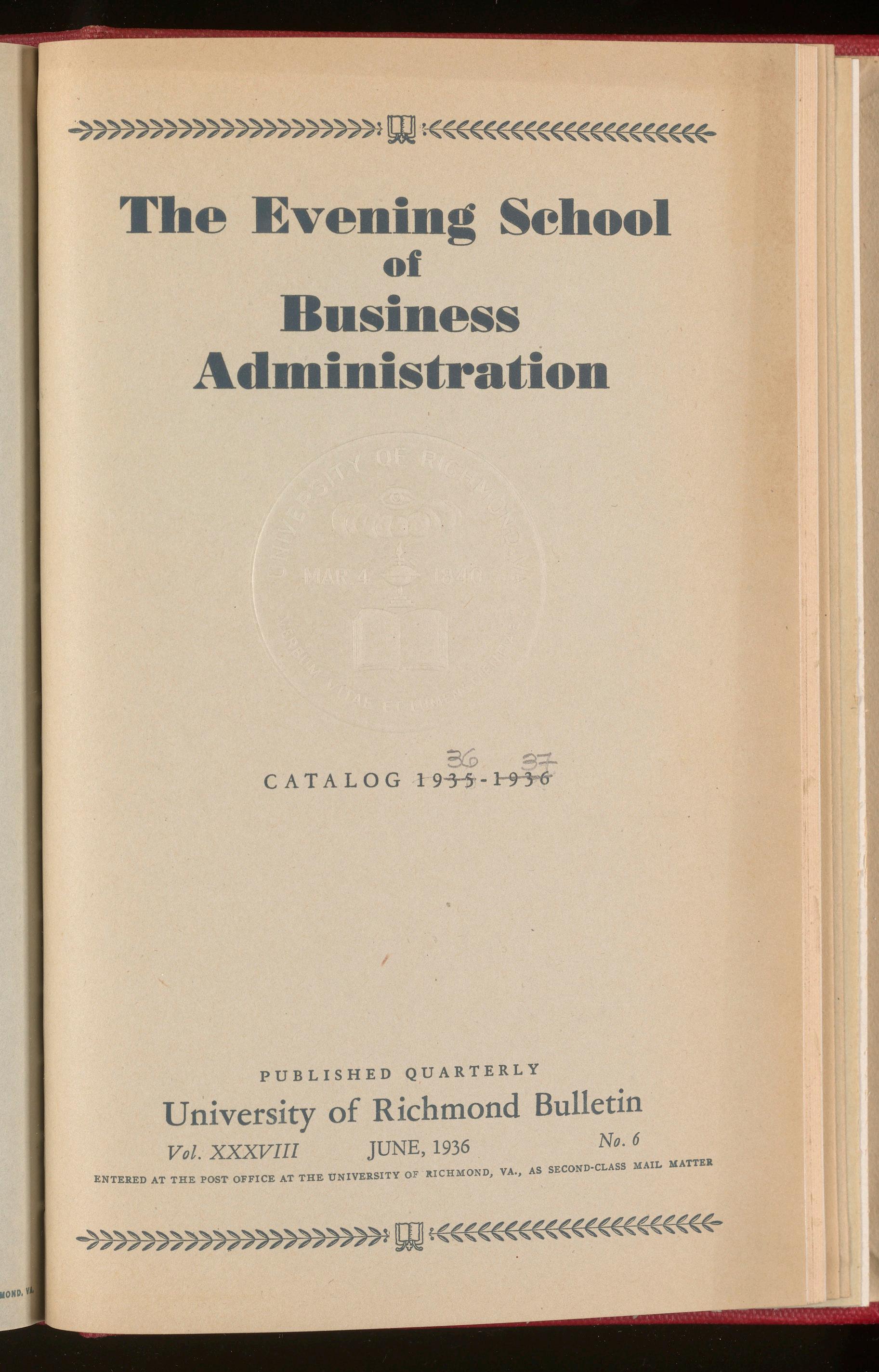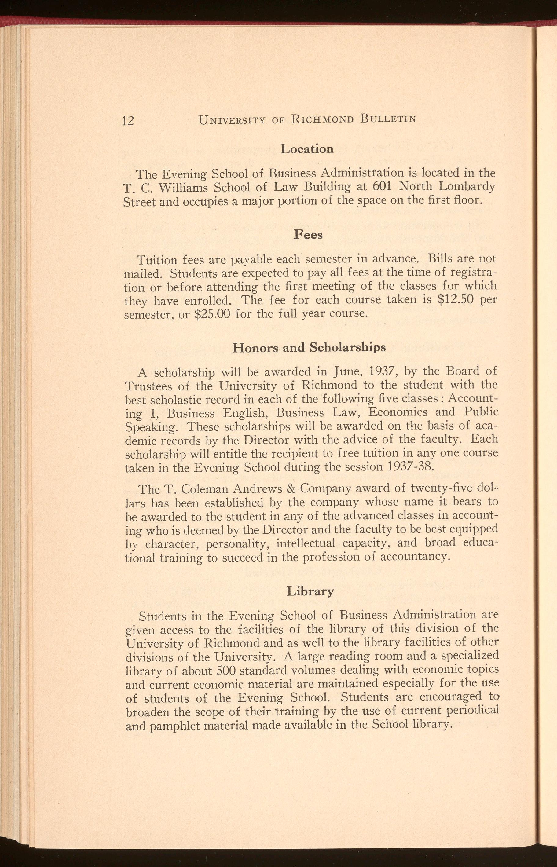 A scholarship will be awarded in June, 1937, by the Board of Trustees of the University of Richmond to the student with the best scholastic record in each of the following five classes: Accounting I, Business English, Business Law, Economics and Public Speaking. These scholarships will be awarded on the basis of academic records by the Director with the advice of the faculty . Each scholarship will entitle the recipient to free tuition in any one course taken in the Evening School during the session 1937-38.