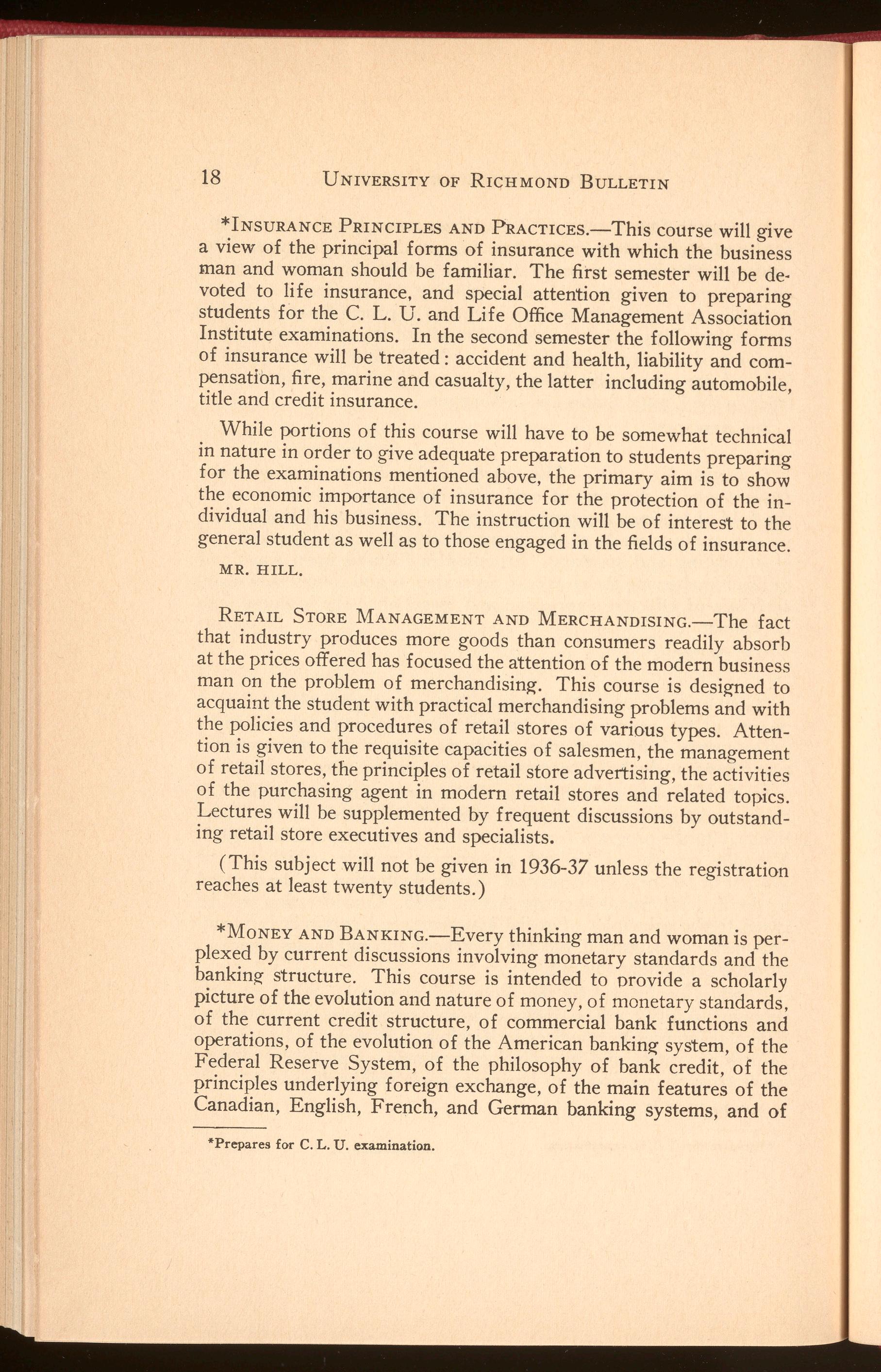 *INSURANCEPRINCIPLESANDPRACTICES.-This course will give a view of the principal forms of insurance with which the business man and woman should be familiar. The first semester will be devoted to life insurance, and special attention given to preparing students for the C. L. U. and Life Office Management Association Institute examinations. In the second semester the following forms of insurance will be treated : accident and health, liability and com- pensation, fire, marine and casualty, the latter including automobile, title and credit insurance.