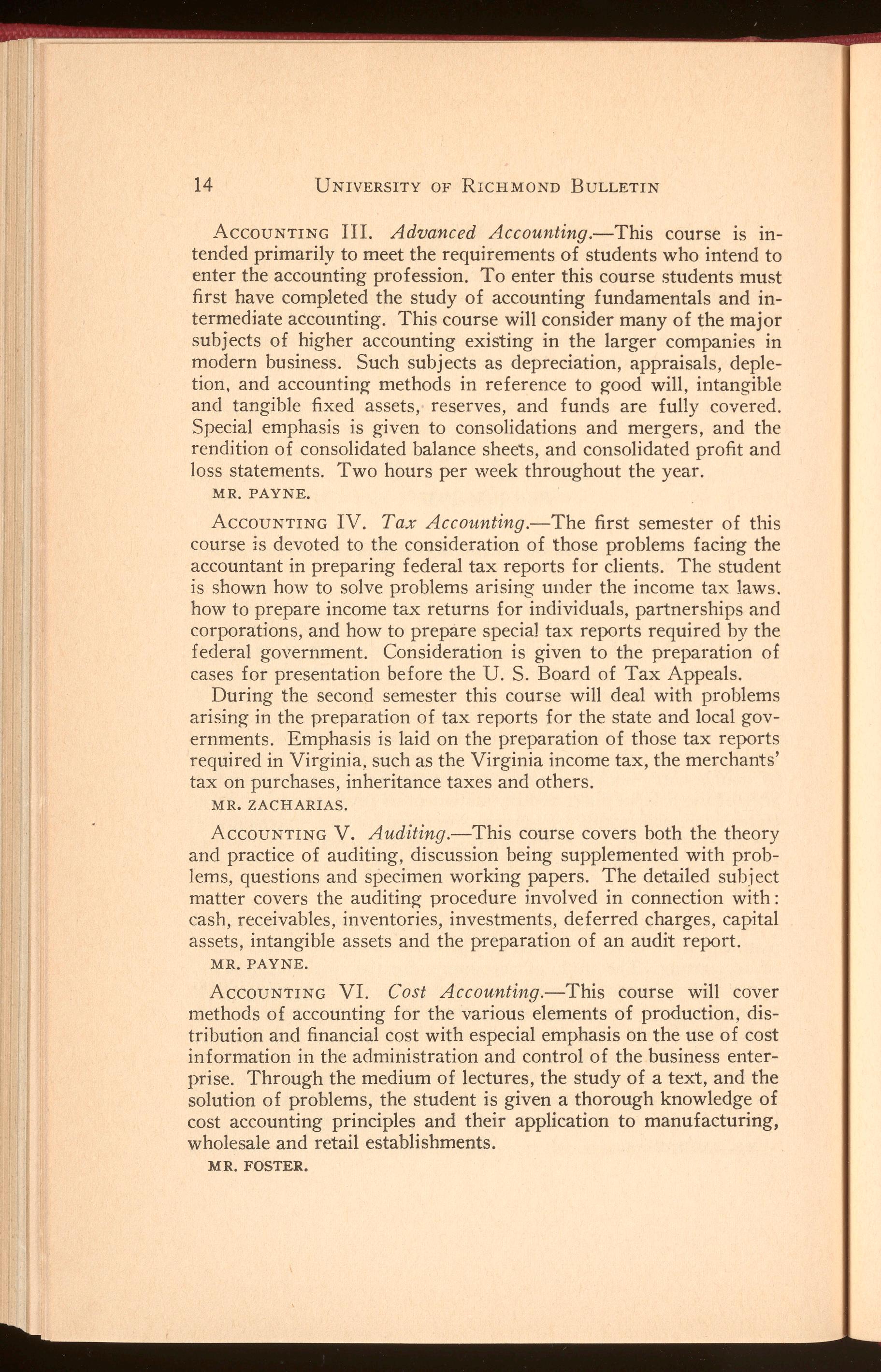 AccouNTING IV. Tax Accounting.-The first semester of this course is devoted to the consideration of those problems facing the accountant in preparing federal tax reports for clients. The student is shown how to solve problems arising under the income tax laws. how to prepare income tax returns for individuals, partnerships and corporations, and how to prepare special tax reports required by the federal government. Consideration is given to the preparation of cases for presentation before the U. S. Board of Tax Appeals. During the second semester this course will deal with problems arising in the preparation of tax reports for the state and local governments. Emphasis is laid on the preparation of those tax reports required in Virginia, such as the Virginia income tax, the merchants' tax on purchases, inheritance taxes and others.