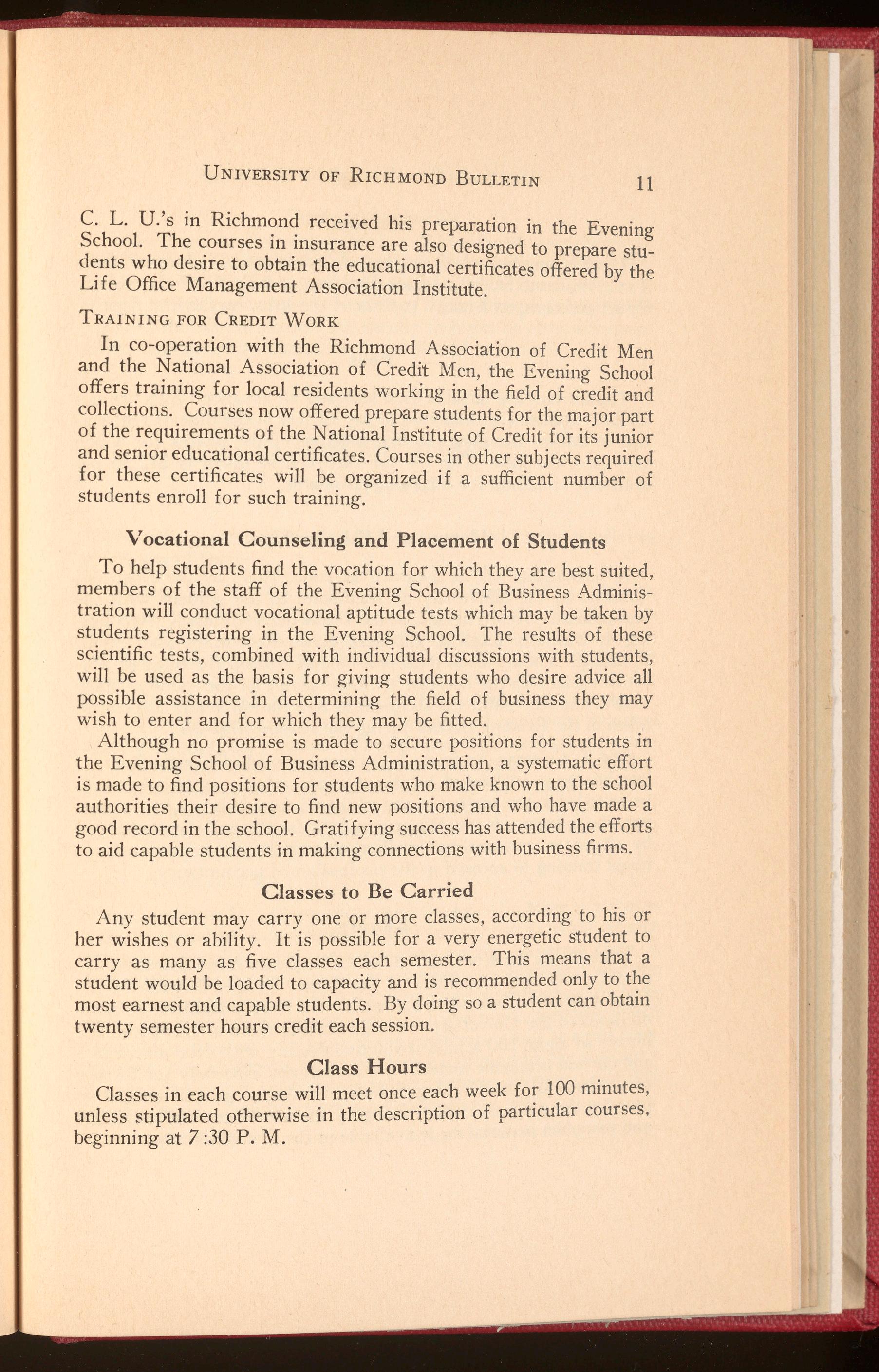 In co-operation with the Richmond Association of Credit Men and the :t:J~tional Associati~m of Cred~t ~en, the Evening School offers training for local residents working m the field of credit and collections .. Courses now offered prepare students for the major part of the reqmrements of the National Institute of Credit for its junior and senior educational certificates. Courses in other subjects required for these certificates will be organized if a sufficient number of students enroll for such training.