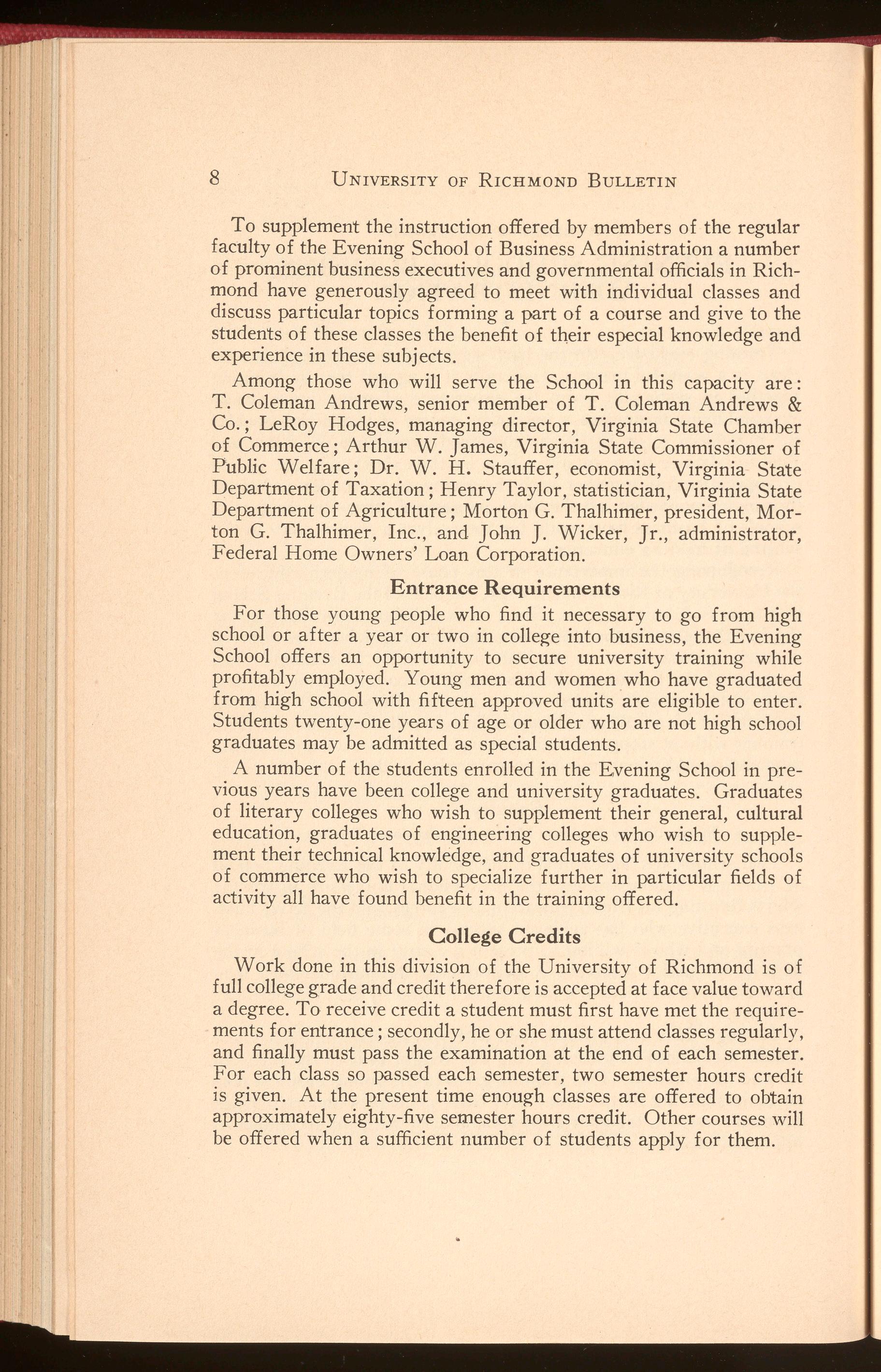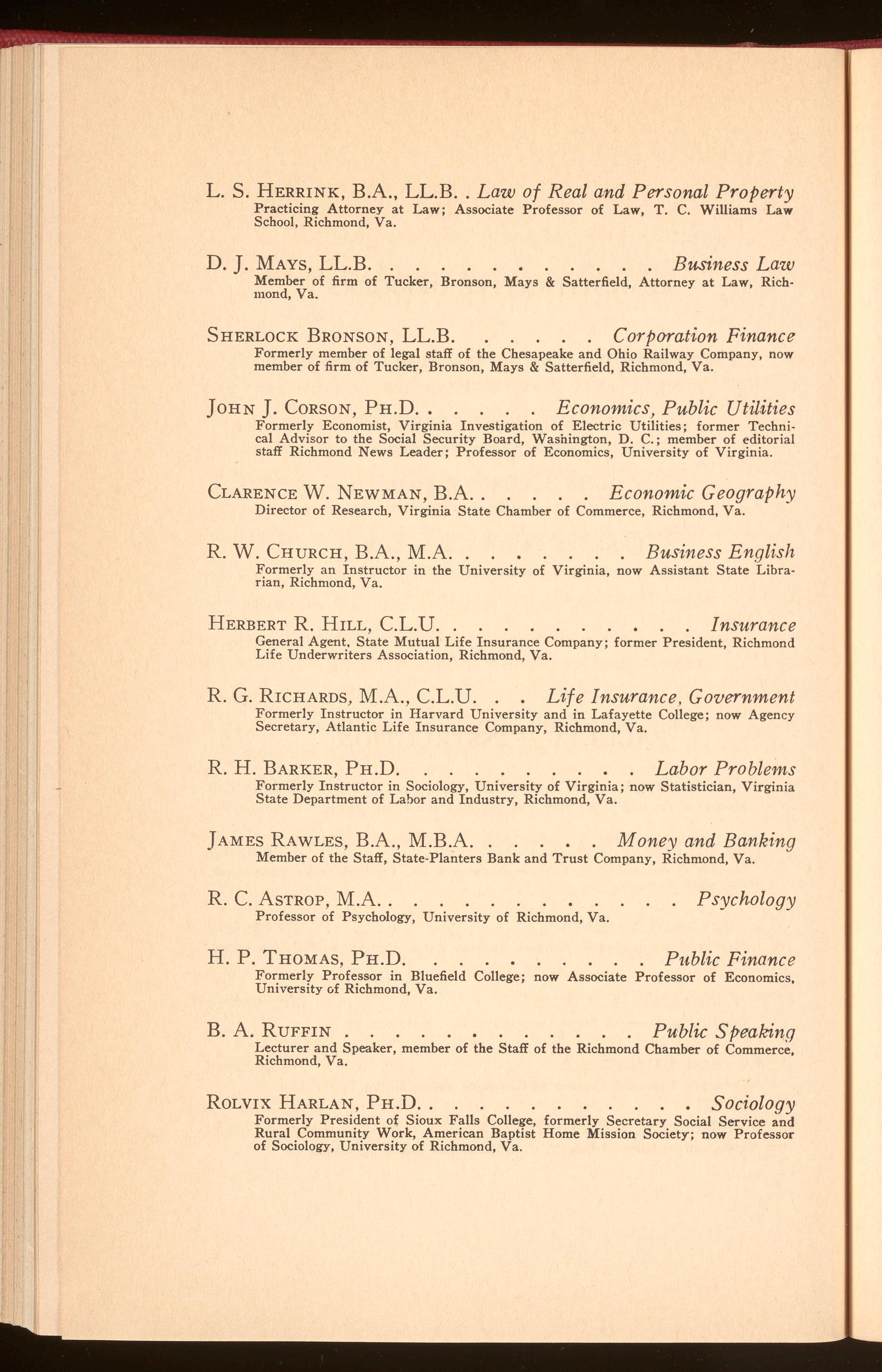 To supplement the instruction offered by members of the regular faculty of the Evening School of Business Administration a number of prominent business executives and governmental officials in Richmond have generously agreed to meet with individual classes and discuss particular topics forming a part of a course and give to the students of these classes the benefit of their especial knowledge and experience in these subjects.