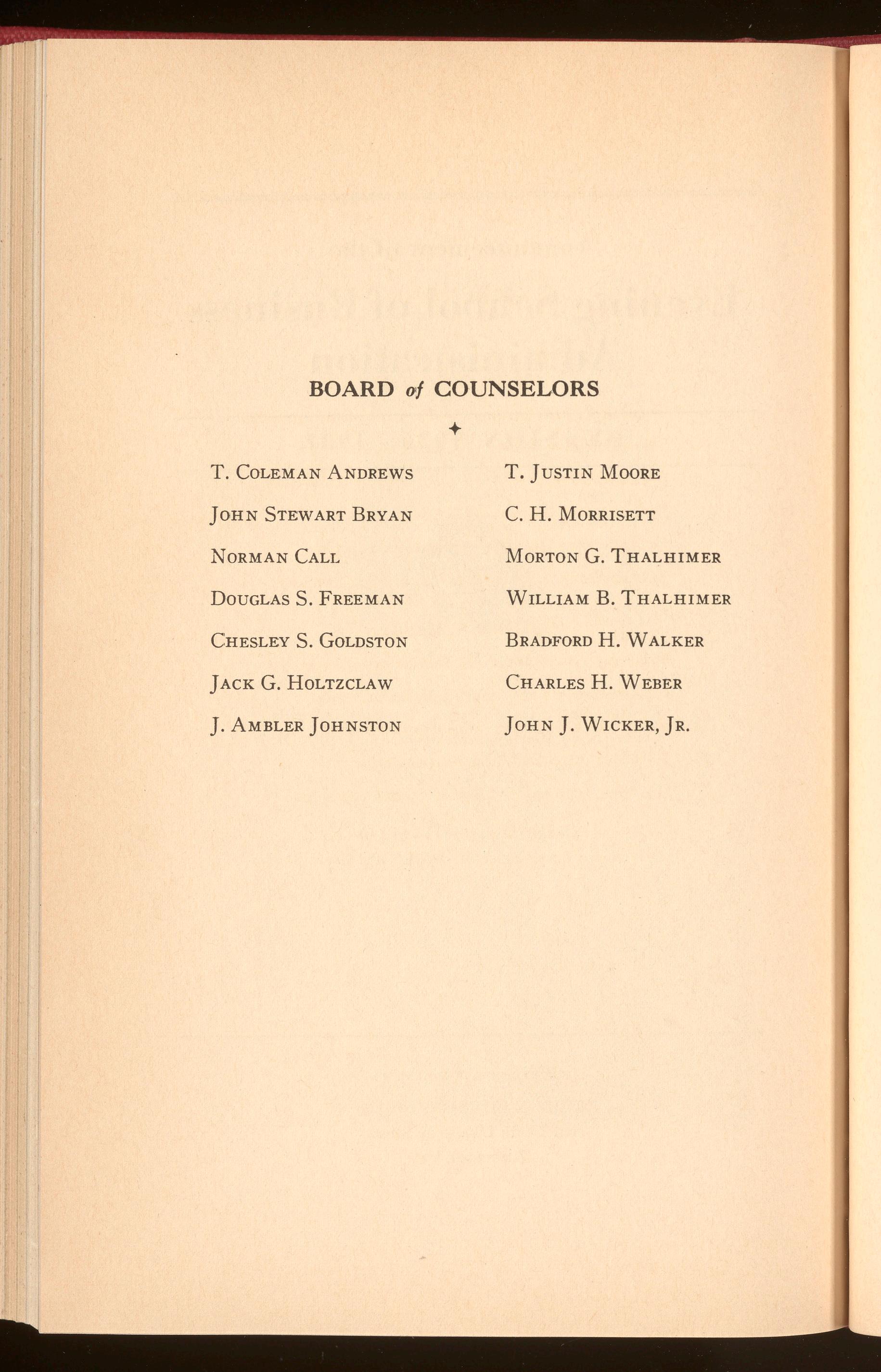 Among those who will serve the School in this capacity are: T. Coleman Andrews, senior member of T. Coleman Andrews & Co.; LeRoy Hodges, managing director, Virginia State Chamber of Commerce; Arthur W. James, Virginia State Commissioner of Public Welfare; Dr. W. H. Stauffer, economist, Virginia State Department of Taxation; Henry Taylor, statistician, Virginia State Department of Agriculture; Morton G. Thalhimer, president, Morton G. Thalhimer, Inc., and John J. Wicker, Jr., administrator, Federal Home Owners' Loan Corporation.