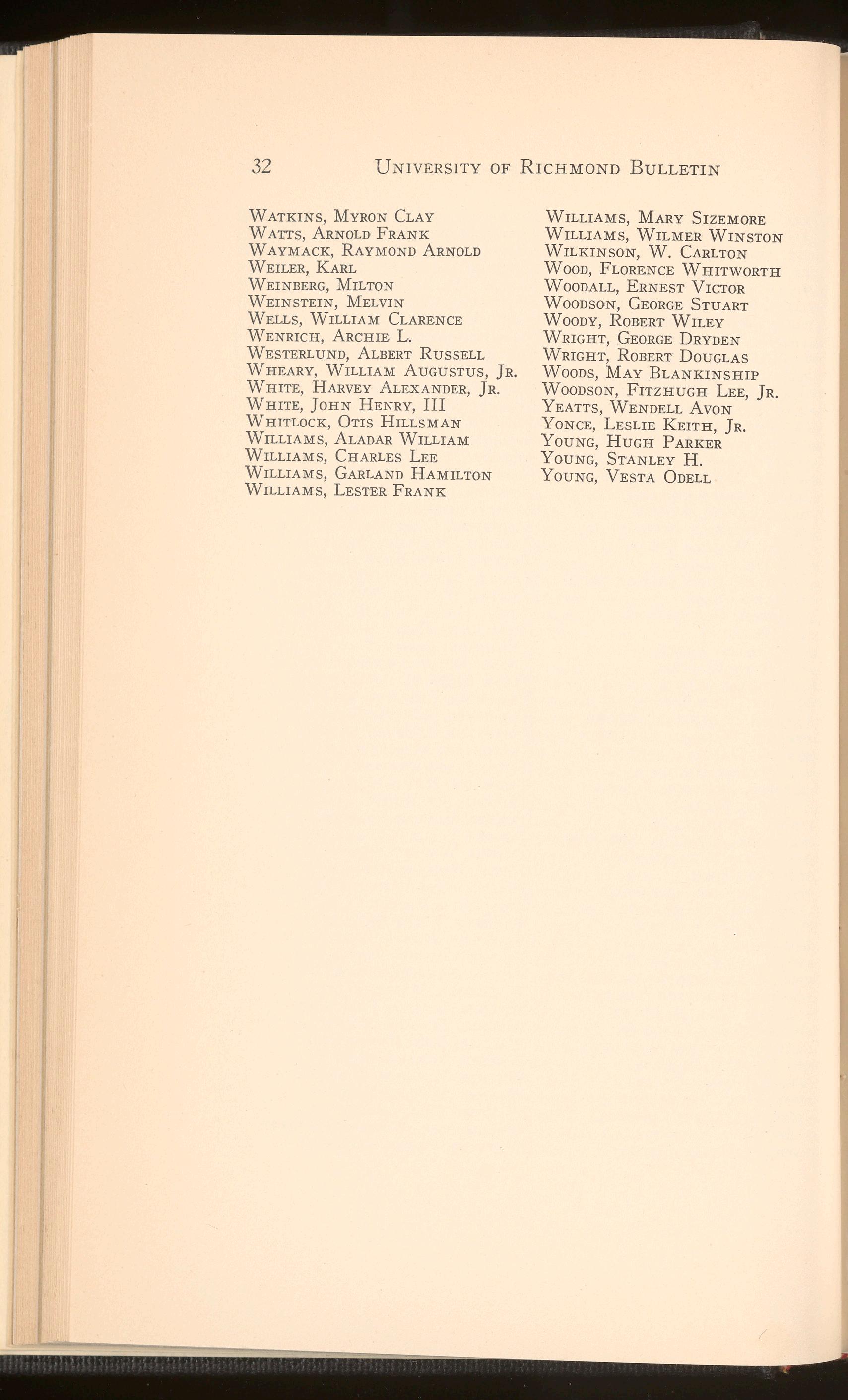 The University of Richmond, chartered in 1921, now includes as integral divisions the Richmond College ( founded 1832) ; the T. C. Williams School of Law ( organized 1870); Westhampton College, a college of liberal arts and sciences for women (1914) ; the Summer School ( 1920) ; the Graduate Department ( 1921) ; and the Evening School of Business Administration ( 1924).