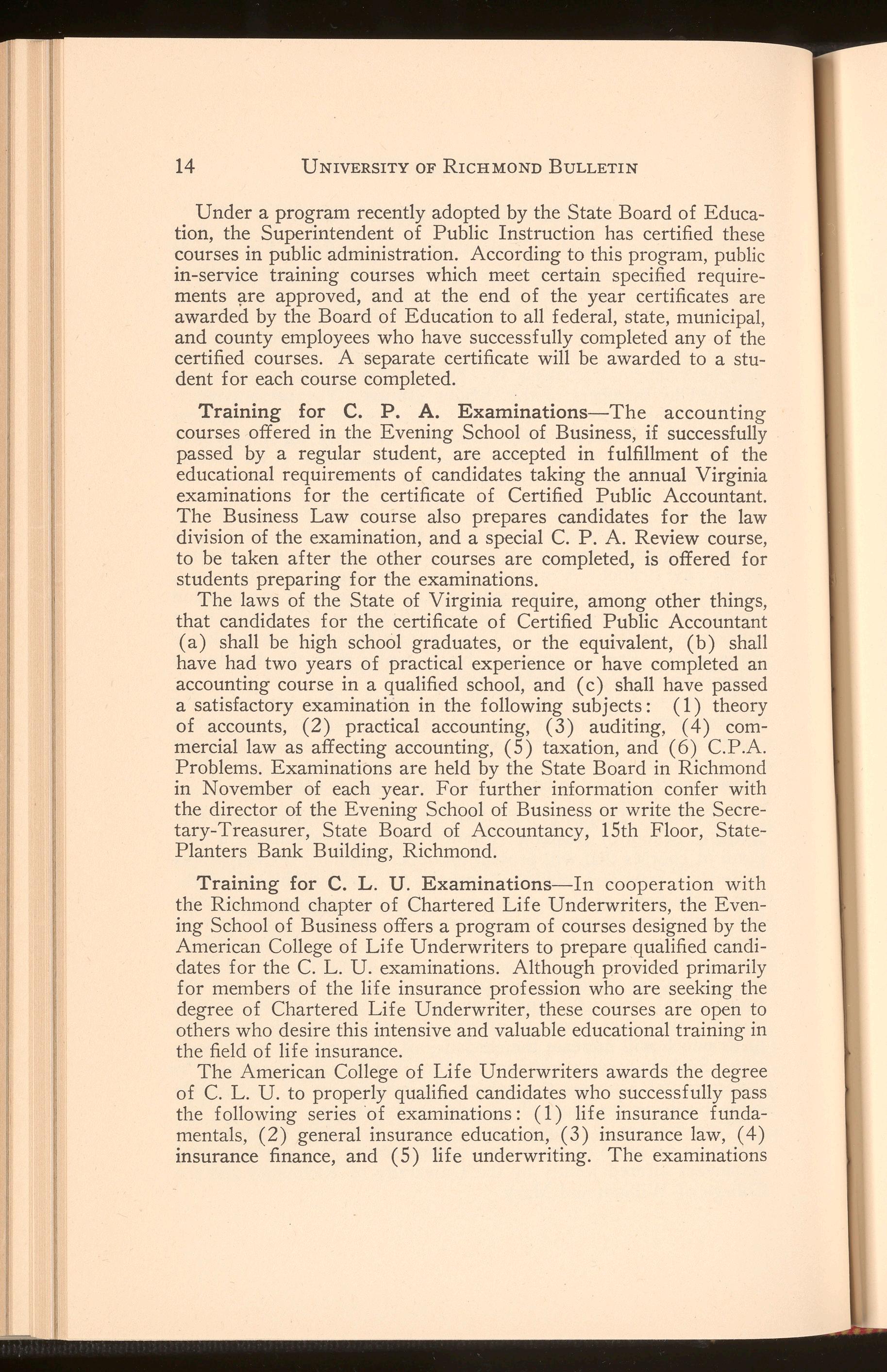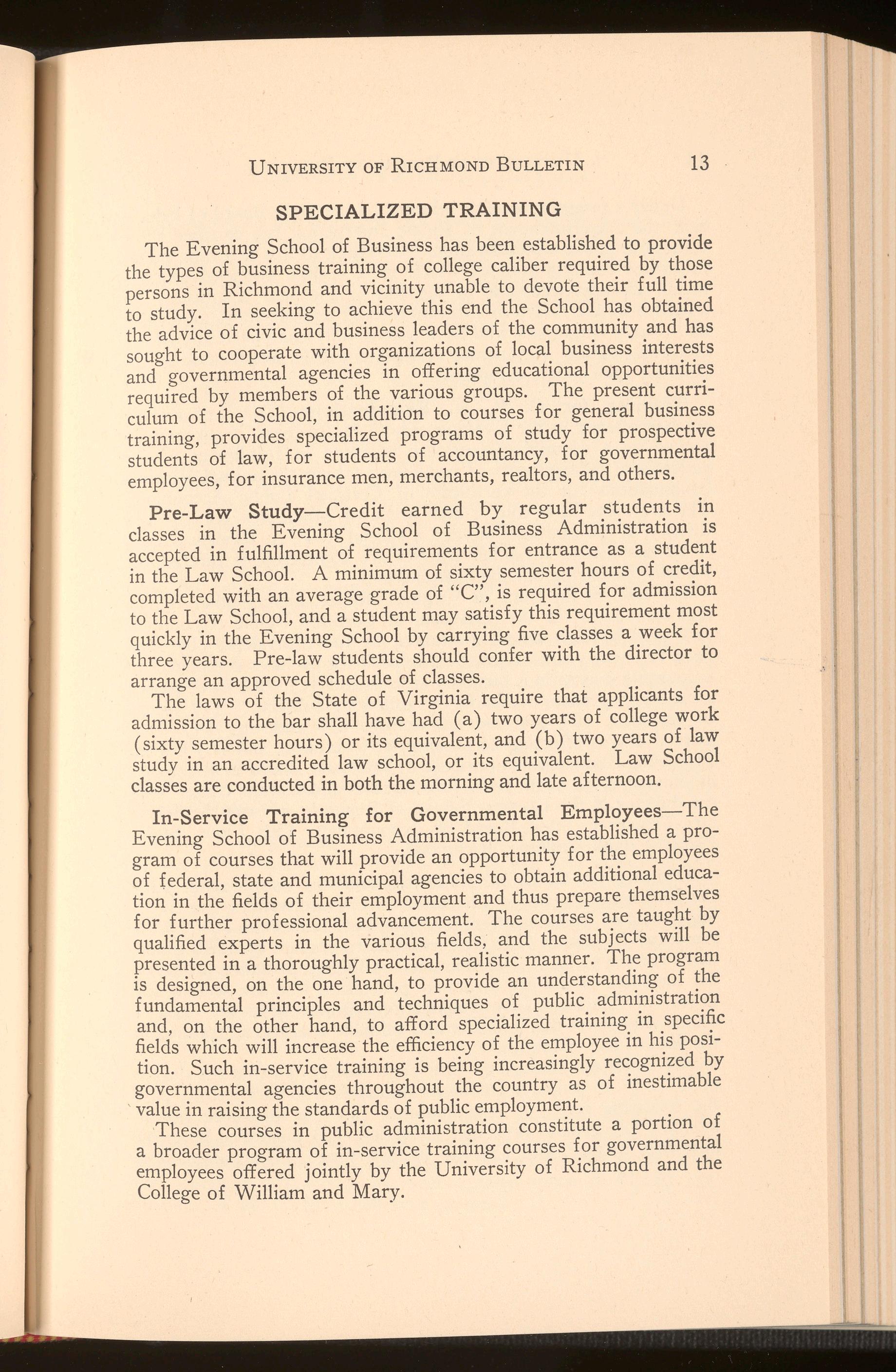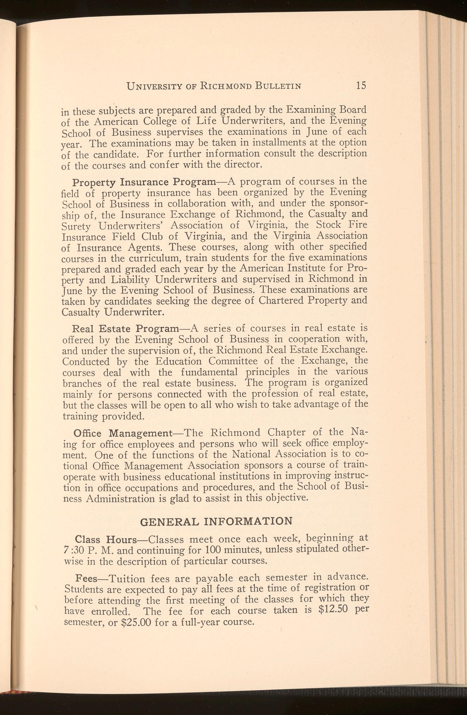 ~HE University of Richmond is the outgrowth of _l the original Richmond College, which was founded in 1832 and chartered in 1840. In 1921 the University of Richmond was chartered and is now comprised of Richmond College; the T. C. Williams School of Law (organized 1870); Westhampton College, a college of liberal arts and sciences for women ( 1914) ; the Summer School ( 1920) ; the Graduate Department ( 1921) ; and the Evening School of Business Administration ( 1924). The Law School and the Evening School of Business Administration are located in Columbia Building, Grace and Lombardy Streets, on the site of the old Richmond College campus. The other four divisions of the University are located on the beautiful suburban campus in Westhampton.