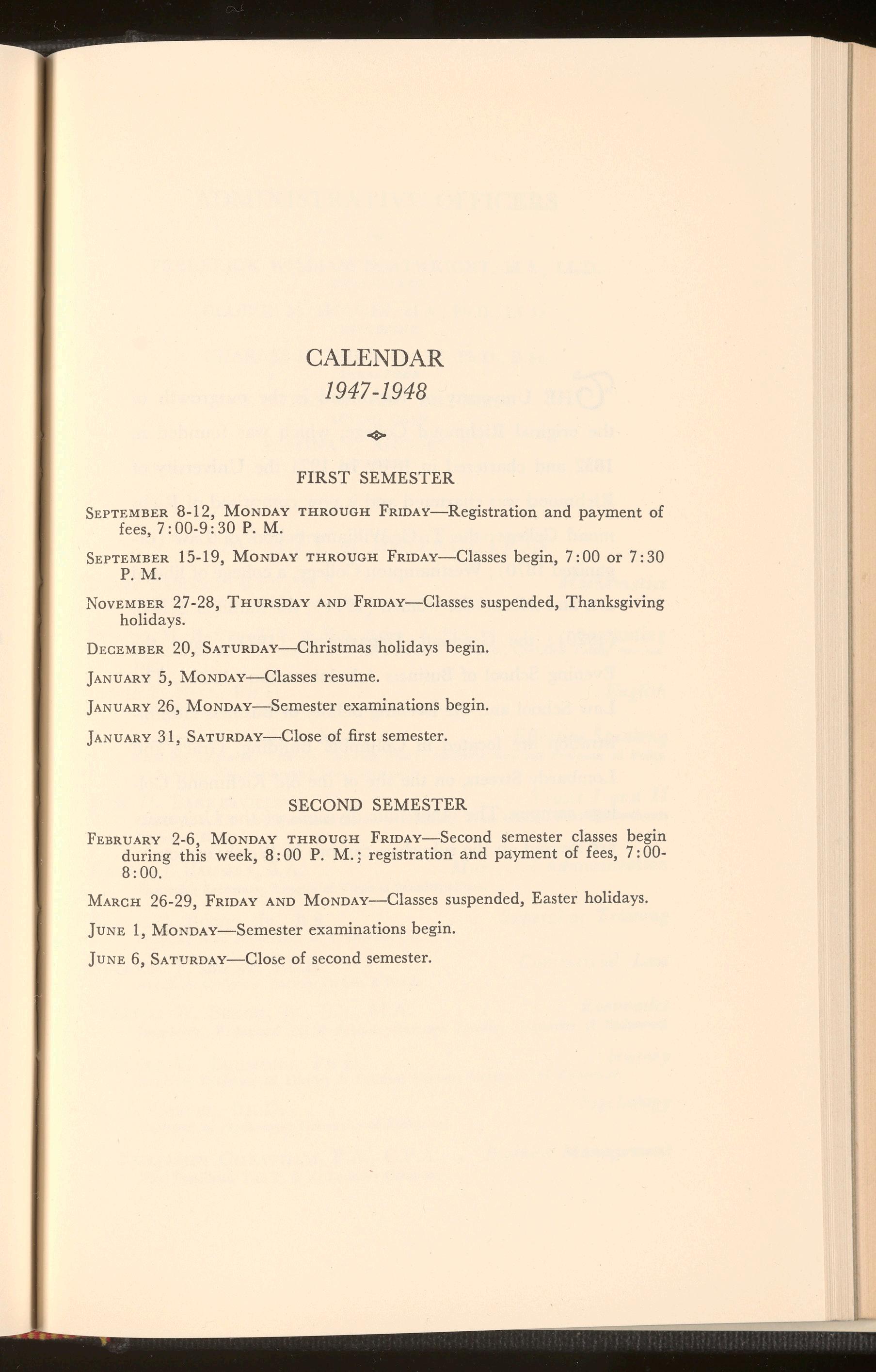 FEBRUARY 2-6, MONDAY THROUGH FRIDAY-Second semester classes begin during this week, 8: 00 P. M.; registration and payment of fees, 7: 008: 00.
