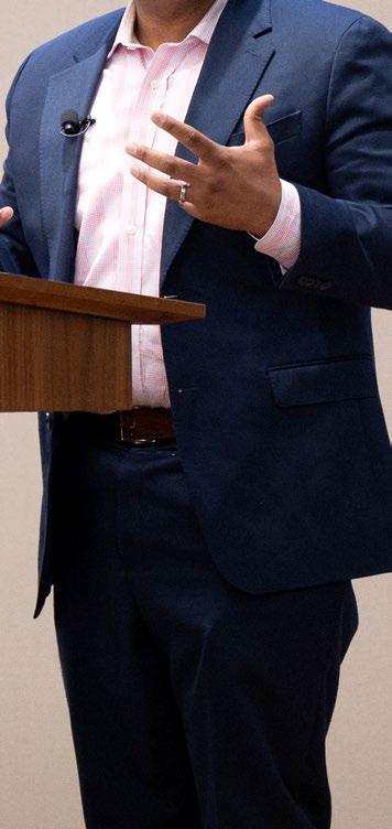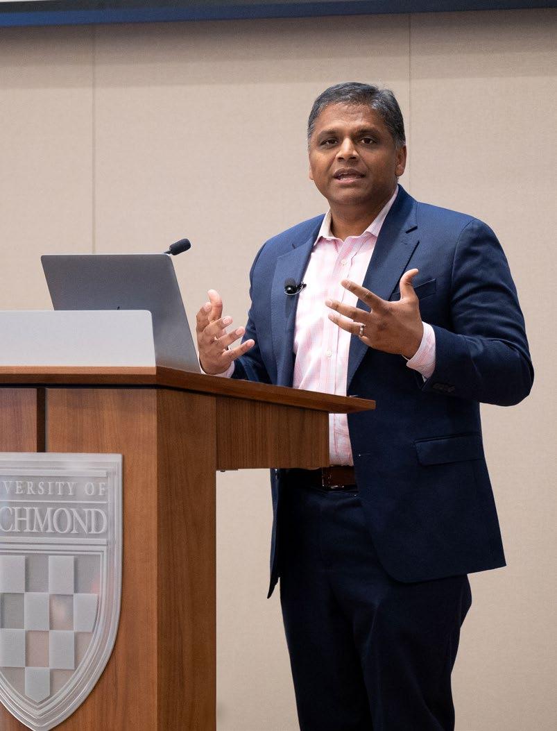 During a luncheon with students, 2023–24 leader-in-residence Dr. Danny TK Avula, at the time the commissioner of the Virginia Department of Social Services, discussed ways to improve public health outcomes. A public health physician himself, he also gave a public presentation on his leadership of Virginia’s highly successful COVID-19 vaccination efforts in 2021.