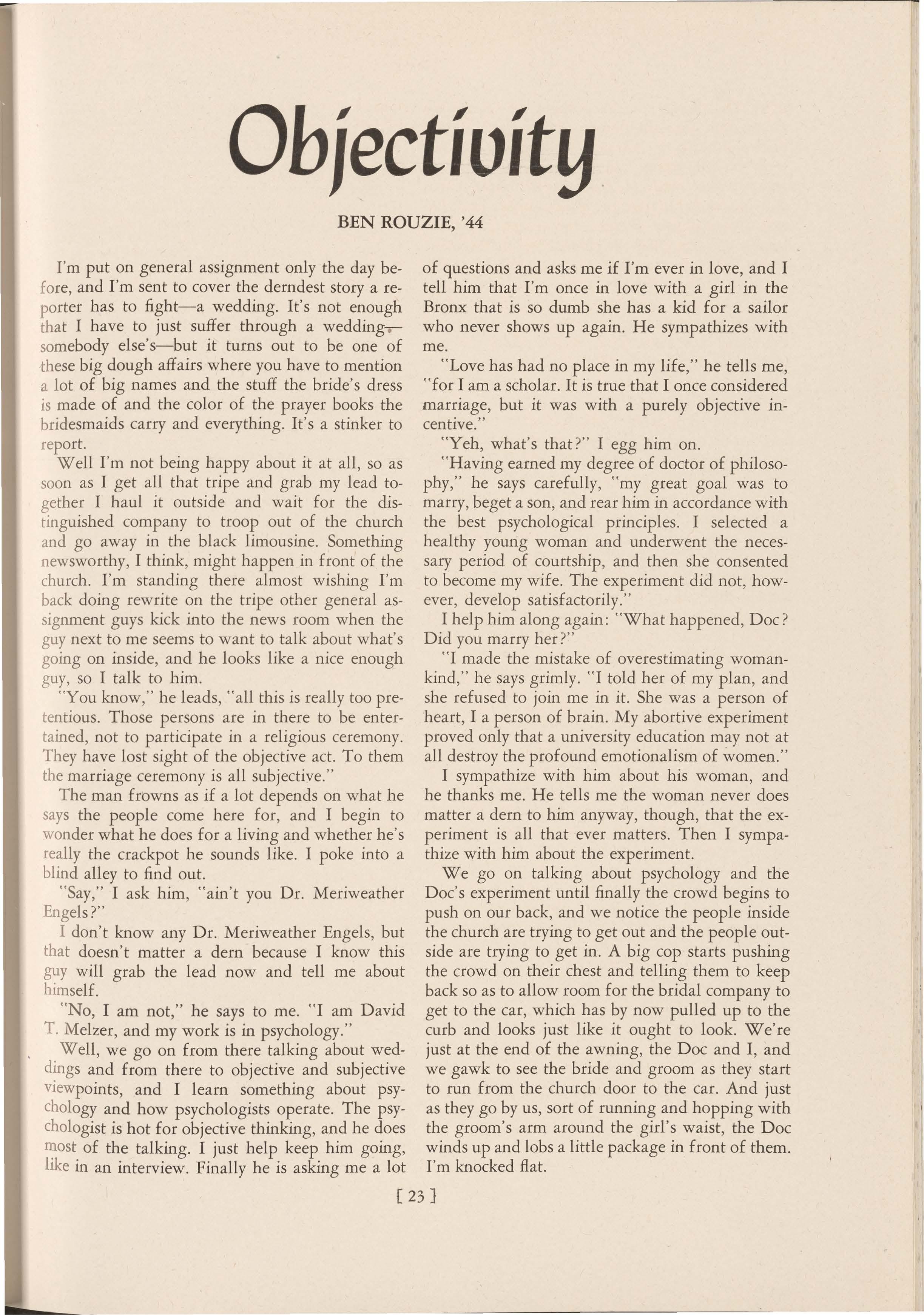 I don't know any Dr. Meriweather Engels, but the church are trying to get out and the people outtha t doesn't matter a dern because I know this side are trying to get in. A big cop starts pushing guy will grab the lead now and tell me about the crowd on their chest and telling them to keep himself. back so as to allow room for the bridal company to "No, I am not," he says to me. "I am David get to the car, which has by now pulled up to the T. M elzer, and my work is in psychology. " curb and looks just like it ought to look. We're W ell, we go on from there talking about wed- just at the end of the awning, the Doc and I, and ding s and from there to objective and subjective we gawk to see the bride and groom as they start viewpoints, and I learn something about psy- to run from the church door to the car. And just chology and how psychologists operate. The psy- as they go by us, sort of running and hopping with chologist is hot for objective thinking, and he does the groom's arm around the girl's waist, the Doc ~o st of the talking. I just help keep him going, winds up and lobs a little package in front of them. ltke in an interview. Finally he is asking me a lot I'm knocked flat.