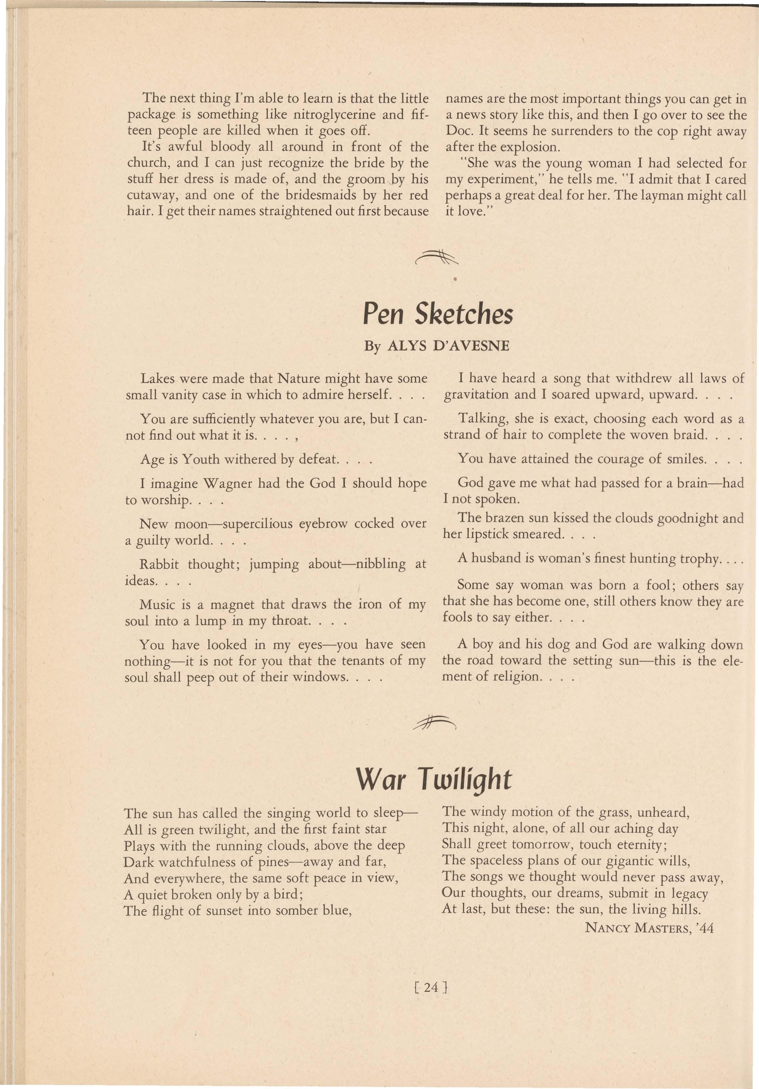 quainted with an object, a character, a people, a nation, a theory, or an idea. Through them we receive the advantages of another's years of research or storehouse of rich experiences. If we really want to know about something we can usually find books, good and bad, that get to the bottom of the situation. Unfortunately, the college student claims that lack of time limits his reading to assigned material. That may be true, but we must take immediate measures to eliminate this conflict. Curtailment of other activities to give the desired time is necessary if we are to do justice to our present and post-war responsibilities.