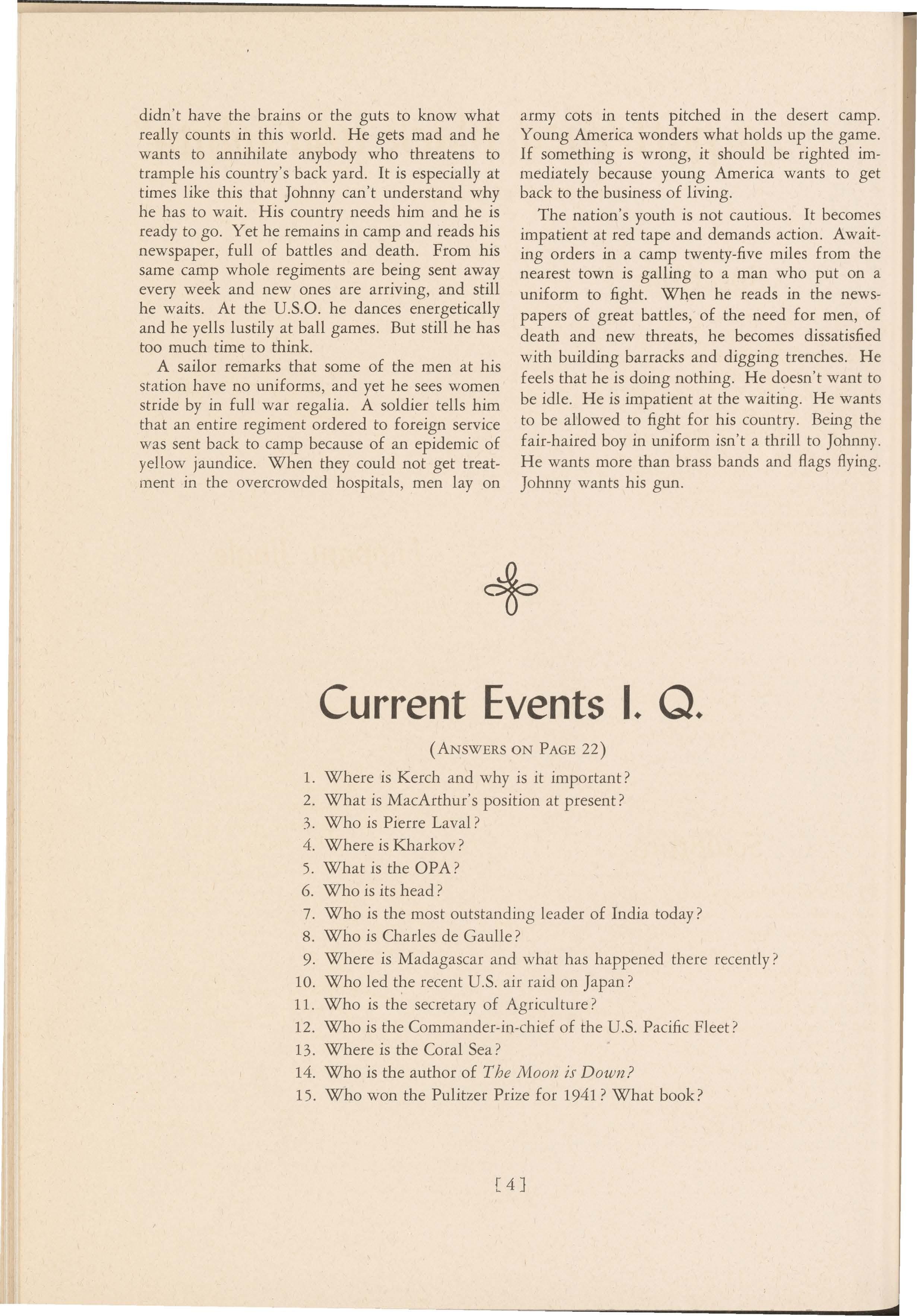 Camps all over the country are full of young men waiting to see action. Most of them have left goo d jobs and many have abandoned a college edu cation. But beneath their brass buttons all of them are restless and uneasy In the camps they are kept busy digging trenches and building barracks, but they are not satisfied with that. They feel that they are losing valuable time and the restlessness grows steadily as word of new losses continues to come. Johnny hears that Tom Jones, of the old gang, was killed in action - and then ano ther-and another. While MacAuthur asked for six planes, he had watched long rows of them take off every day to shoot at little white bags instead of Japanese. For every ship lost to the enemy a h undred sailors wait to be called to sea duty. And when the going gets tough, Johnny prays to be sent to help