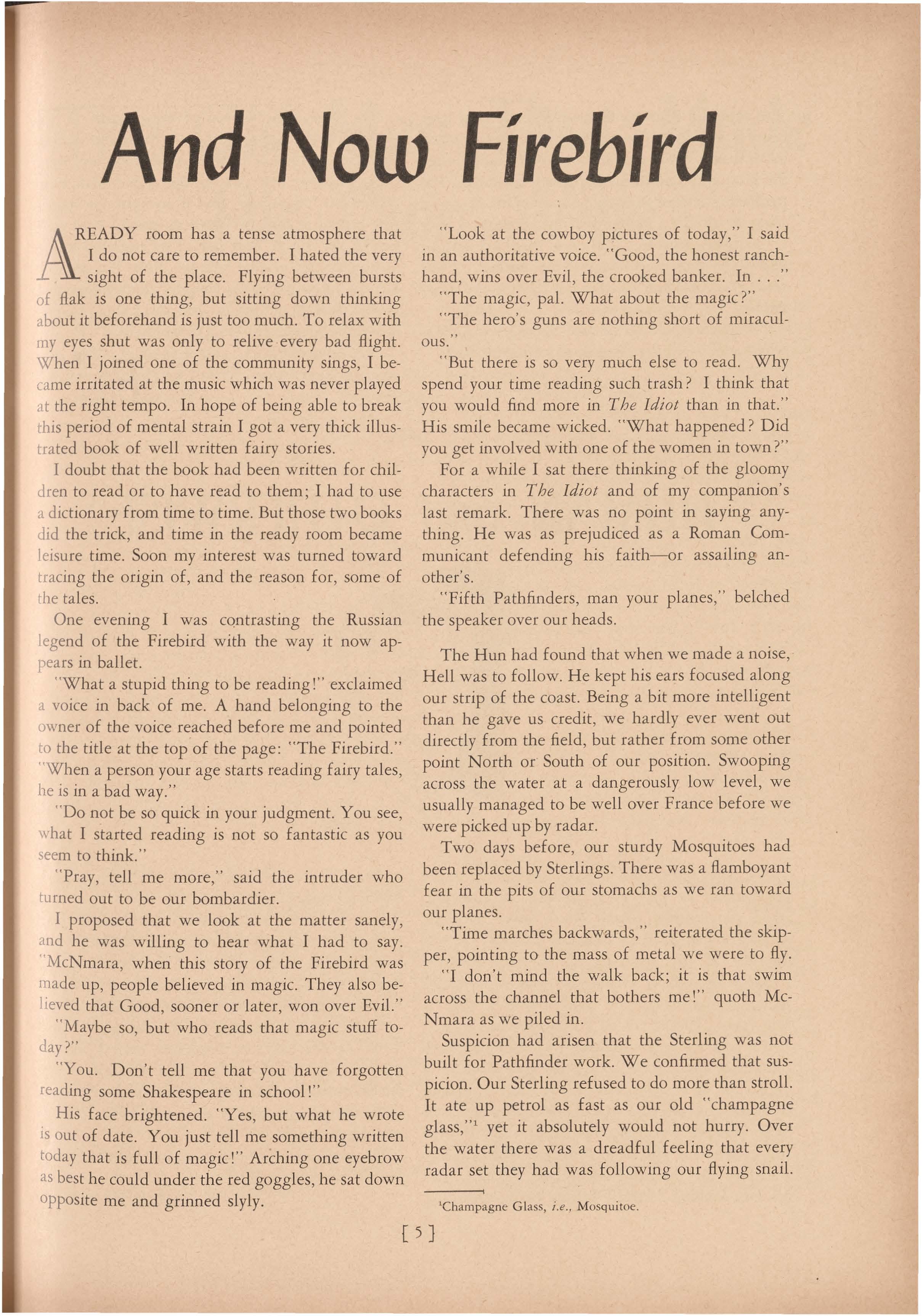 " What a stupid thing to be reading!" exclaimed a voice in back of me. A hand belonging to the owner of the voice reached before me and pointed to the title at the top of the page: "The Firebird." "W hen a person your age starts reading fairy tales, he is in a bad way."