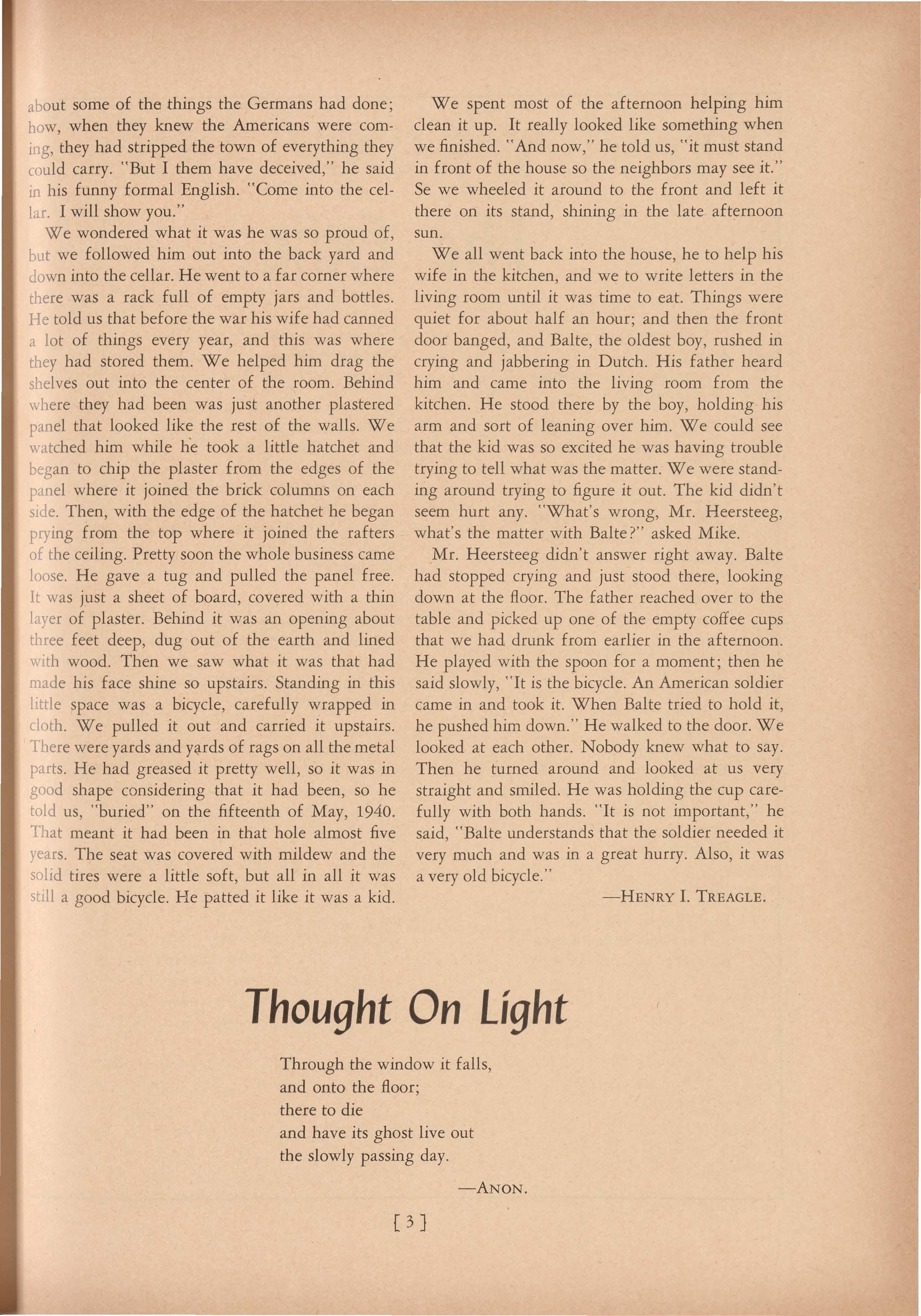 about some of the things the Germans had done; how, when they knew the Americans were coming, they had stripped the town of everything they could carry. "But I them have deceived," he said in his funny formal English. "Come into the cellar. I will show you."