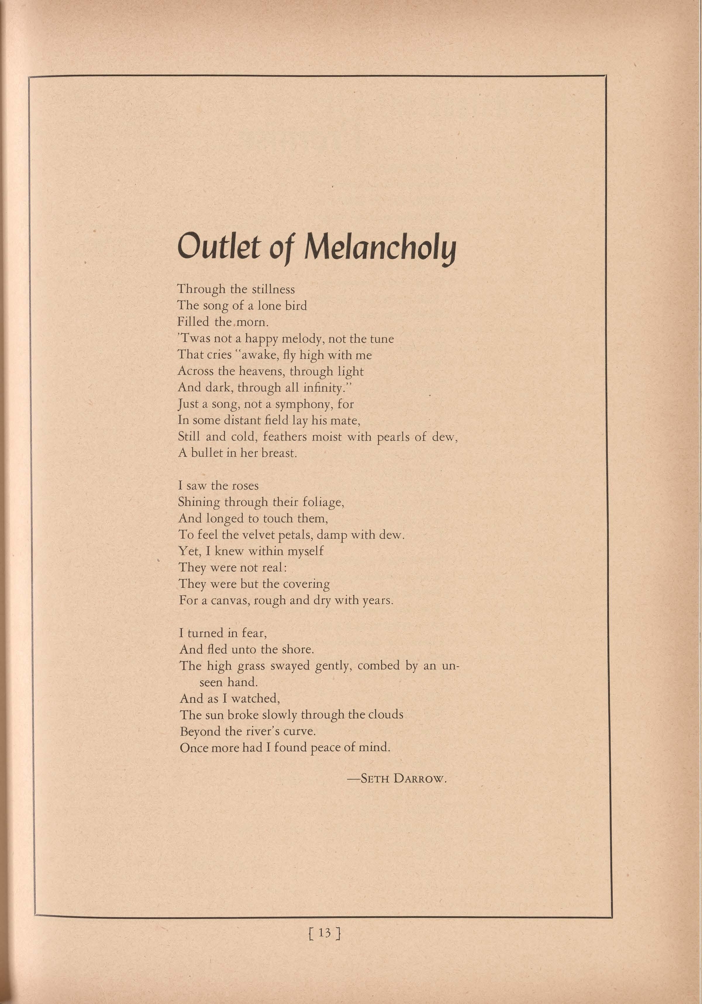 I turned in fear, And fled unto the shore. The high grass swayed gently, combed by an unseen hand. And as I watched, The sun broke slowly through the clouds Beyond the river's curve. Once more had I found peace of mind.