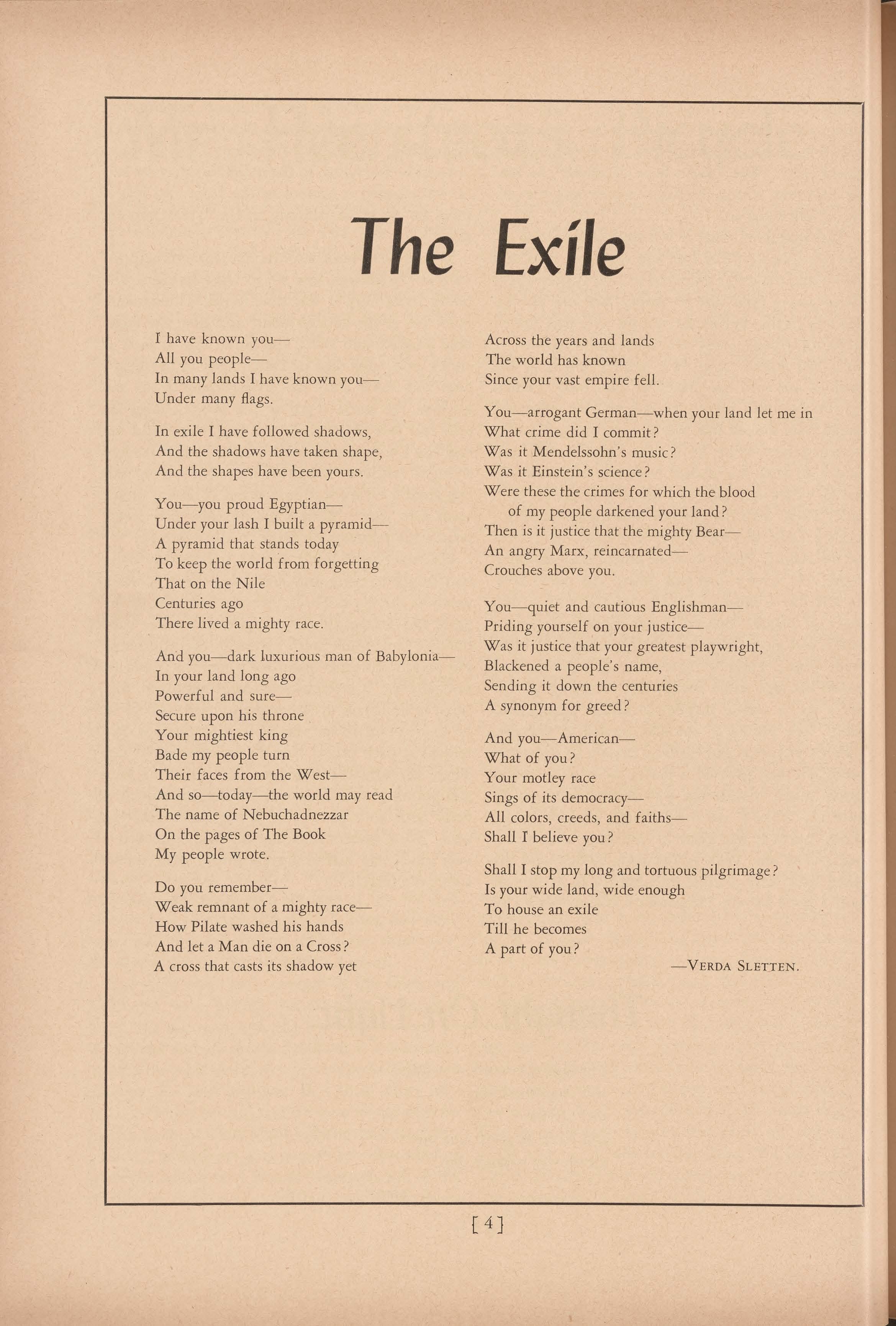 And you- dark luxurious man of BabyloniaIn your land long ago Powerful and sureSecure upon his throne Your mightiest king Bade my people turn Their faces from the WestAnd so-today-the world may read The name of Nebuchadnezzar