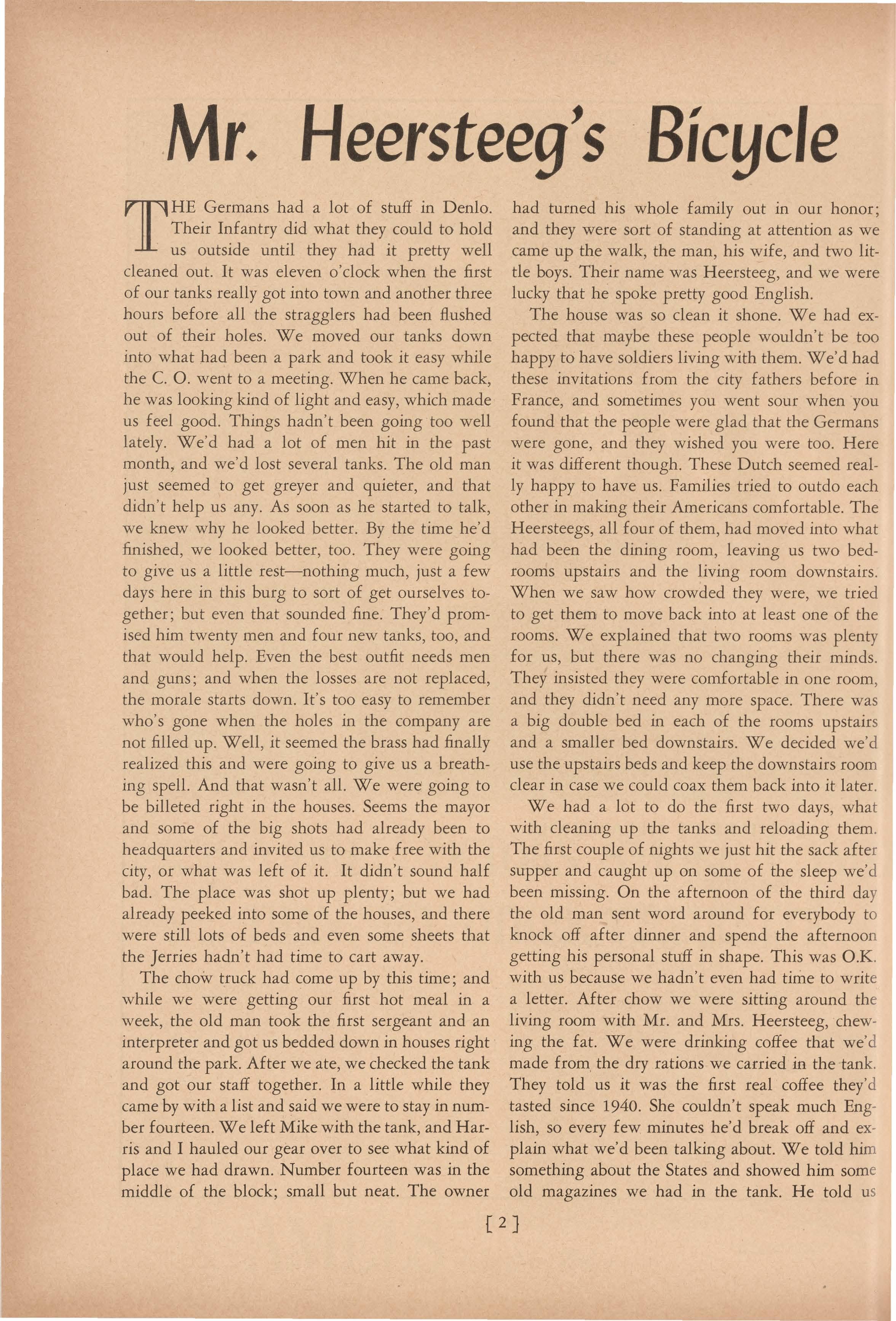 The house was so clean it shone. We had expected that maybe these people wouldn't be too happy to have soldiers living with them. We'd had these invitations from the city fathers before in France, and sometimes you went sour when you found that the people were glad that the Germans were gone, and they wished you were too. Here it was different though. These Dutch seemed really happy to have us. Families tried to outdo each other in making their Americans comfortable. The Heersteegs, all four of them, had moved into what had been the dining room, leaving us two bedrooms upstairs and the living room downstairs. When we saw how crowded they were, we tried to get them to move back into at least one of the rooms. We explained that two rooms was plenty for us, but there was no changing their minds They insisted they were comfortable in one room , and they didn't need any more space. There was a big double bed in each of the rooms upstair s and a smaller bed downstairs. We decided we' d use the upstairs beds and keep the downstairs room clear in case we could coax them back into it later . We had a lot to do the first two days, wha t with cleaning up the tanks and reloading them The first couple of nights we just hit the sack afte r supper and caught up on some of the sleep we 'd been missing. On the afternoon of the third da y the old man sent word around for everybody t o knock off after dinner and spend the afternoo n getting his personal stuff in shape. This was O.K. with us because we hadn't even had time to writ e a letter. After chow we were sitting around th e living room with Mr. and Mrs. Heersteeg, chewing the fat. We were drinking coffee that we' d made from . the dry rations we carried in the tank. They told us it was the first real coffee they' d tasted since 1940. She couldn't speak much English, so every few minutes he'd break off and explain what we'd been talking about. We told hi m something about the States and showed him some ol d magazines we had in the tank. He told u s [ 2 J