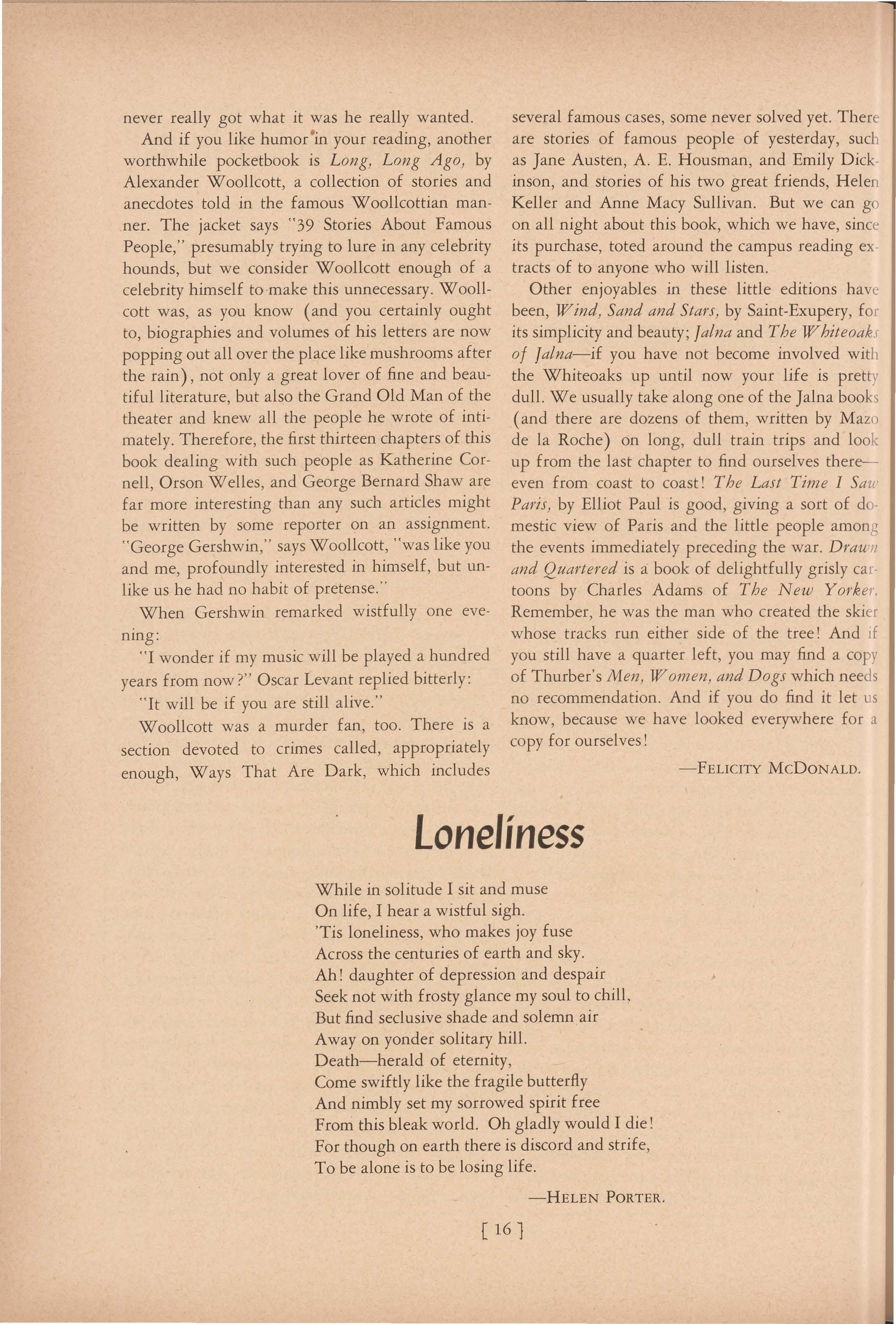 And if you like humor •in your reading, another worthwhile pocketbook is Long, Long Ago, by Alexander W oollcott, a collection of stories and anecdotes told in the famous Woollcottian manner. The jacket says "39 Stories About Famous People," presumably trying to lure in any celebrity hounds, but we consider Woollcott enough of a celebrity himself to make this unnecessary. W oollcott was, as you know ( and you certainly ought to, biographies and volumes of his letters are now popping out all over the place like mushrooms after the rain), not only a great lover of fine and beautiful literature, but also the Grand Old Man of the theater and knew all the people he wrote of intimately. Therefore, the first thirteen chapters of this book dealing with such people as Katherine Cornell, Orson Welles, and George Bernard Shaw are far more interesting than any such articles might be written by some reporter on an assignment. " George Gershwin," says Woollcott, "was like you and me, profoundly interested in himself, but unlike us he had no habit of pretense."