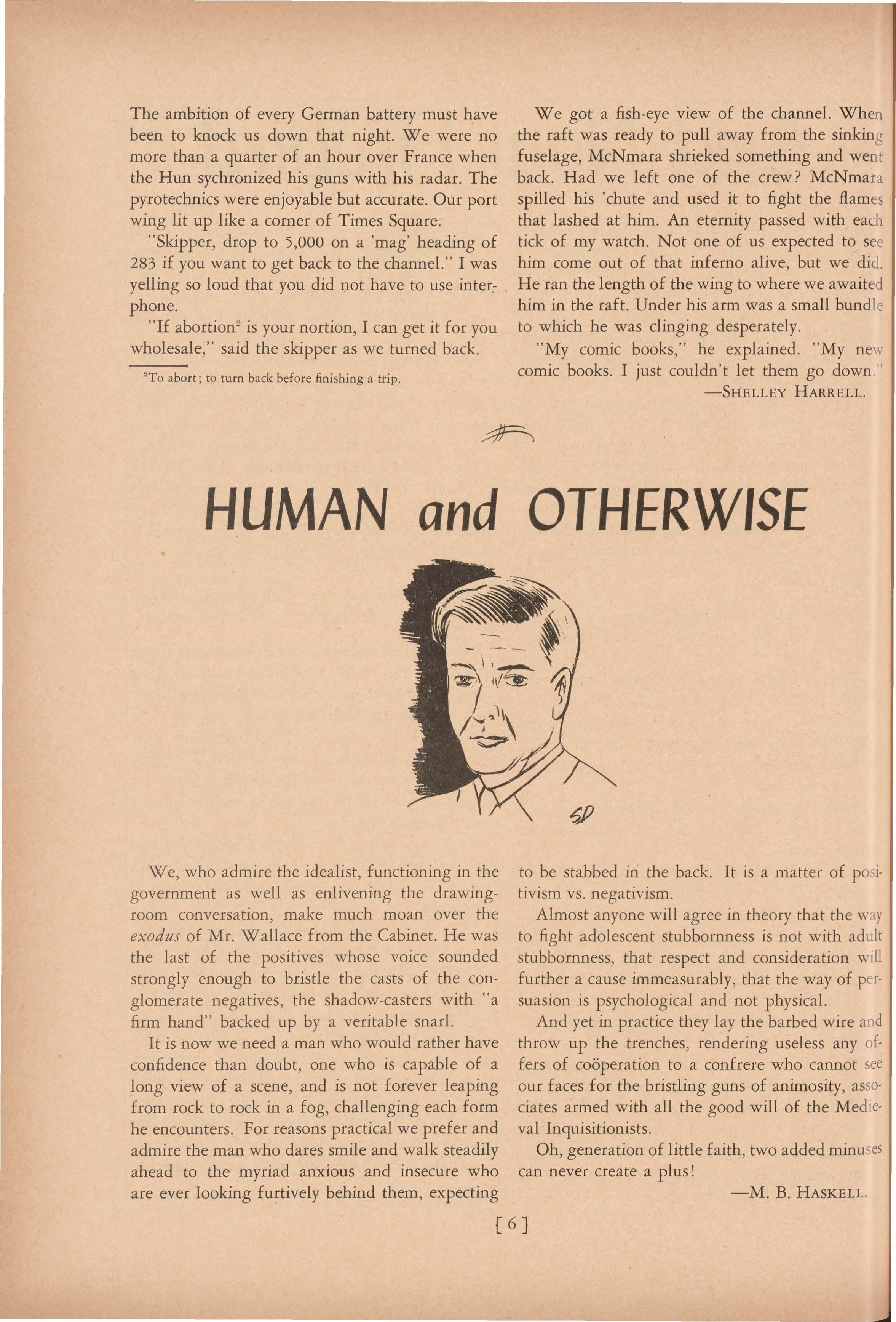 several famous cases, some never solved yet. Ther e are stories of famous people of yesterday, such as Jane Austen, A. E. Housman, and Emily Dickinson, and stories of his two great friends, Hele n Keller and Anne Macy Sullivan. But we can go on all night about this book, which we have, since its purchase, toted around the campus reading extracts of to anyone who will listen . Other enjoyables in these little editions ha ve been, Wind , Sand and Stars, by Saint-Exupery, fo r its simplicity and beauty; Jalna and The W hiteoa k s of Jalna-if you have not become involved wit h the Whiteoaks up until now your life is pret ty dull. We usually take along one of the Jalna boo ks ( and there are dozens of them , written by Ma zo de la Roche) on long , dull train trips and lo ok up from the last chapter to find ourselves thereeven from coast to coast! The Last Time I Sau· Paris, by Elliot Paul is good , giving a sort of dmestic view of Paris and the little people amo ng the events immediately preceding the war. Dra w n and Quartered is a book of delightfully grisly ca rtoons by Charles Adams of The New York er. Remember, he was the man who created the skier whose tracks run either side of the tree! And if you still have a quarter left, you may find a cop y of Thurber's Men , Women , and Dogs which nee ds no recommendation. And if you do find it let us know, because we have looked everywhere for a copy for ourselves!