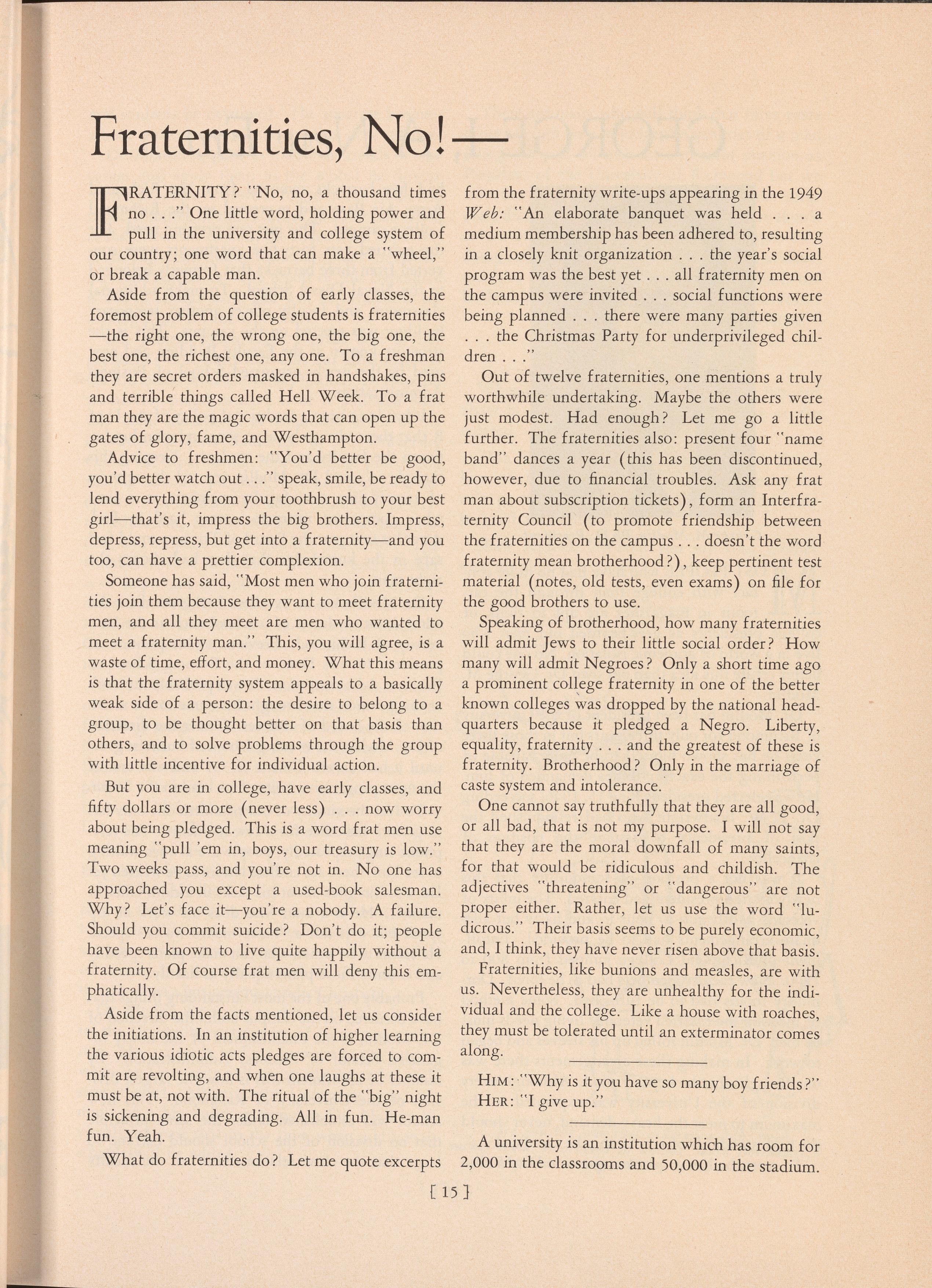 I have been a student at Westhampton for over a month now and I have never had a date with a fraternity man. Of course, my whole existence does not revolve around men alone and I don ' t want you