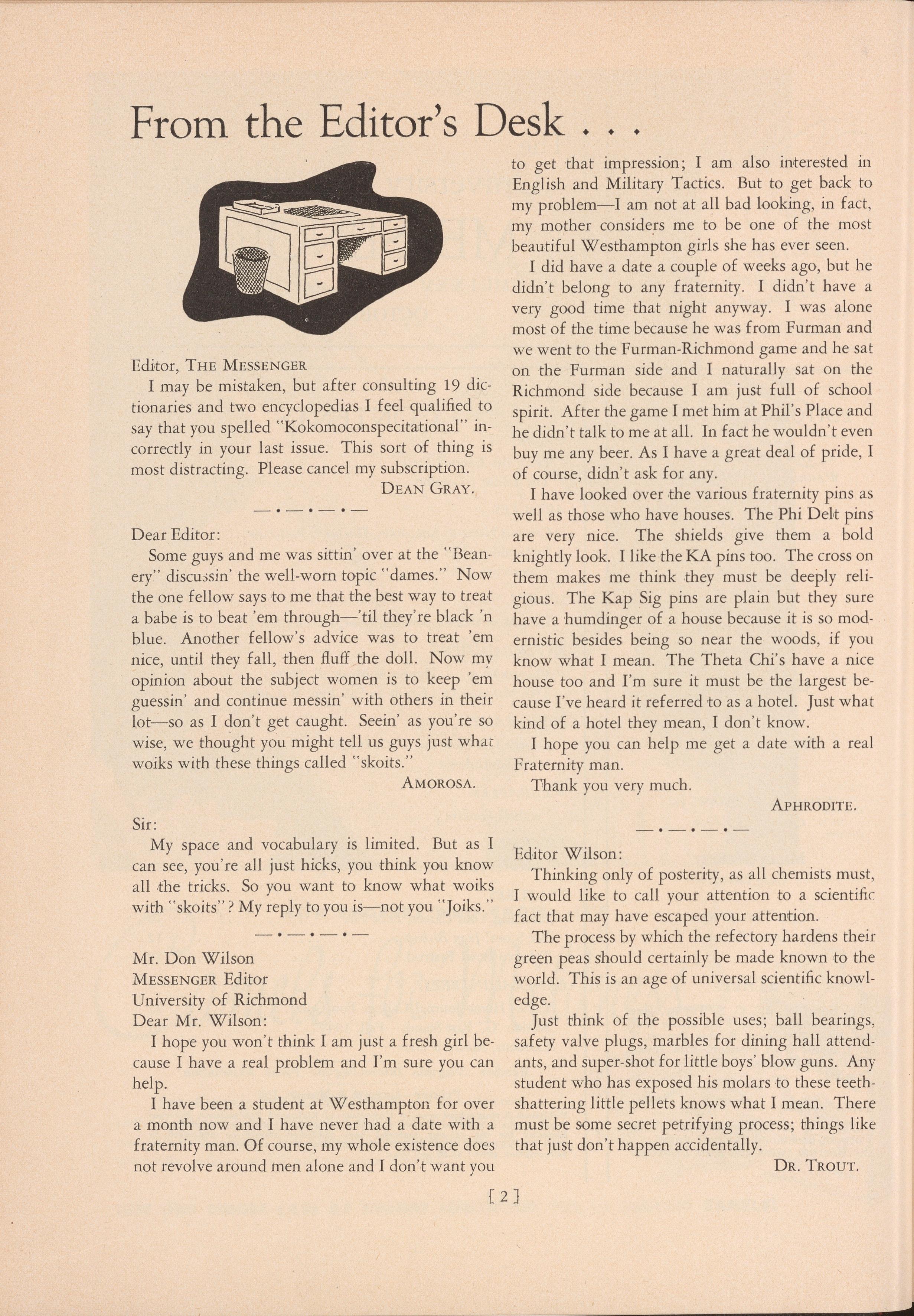 to get that impression; I am also interested in English and Military Tactics. But to get back to my problem-I am not at all bad looking, in fact , my mother conside!S me to be one of the most beautiful Westhampton girls she has ever seen. I did have a date a couple of weeks ago, but he didn ' t belong to any fraternity I didn't have a very good time that night anyway. I was alone most of the time because he was from Furman and we went to the Furman-Richmond game and he sat on the Furman side and I naturally sat on the Richmond side because I am just full of school spirit. After the game I met him at Phil's Place and he didn ' t talk to me at all. In fact he wouldn ' t even buy me any beer. As I have a great deal of pride , I of course, didn ' t ask for any.