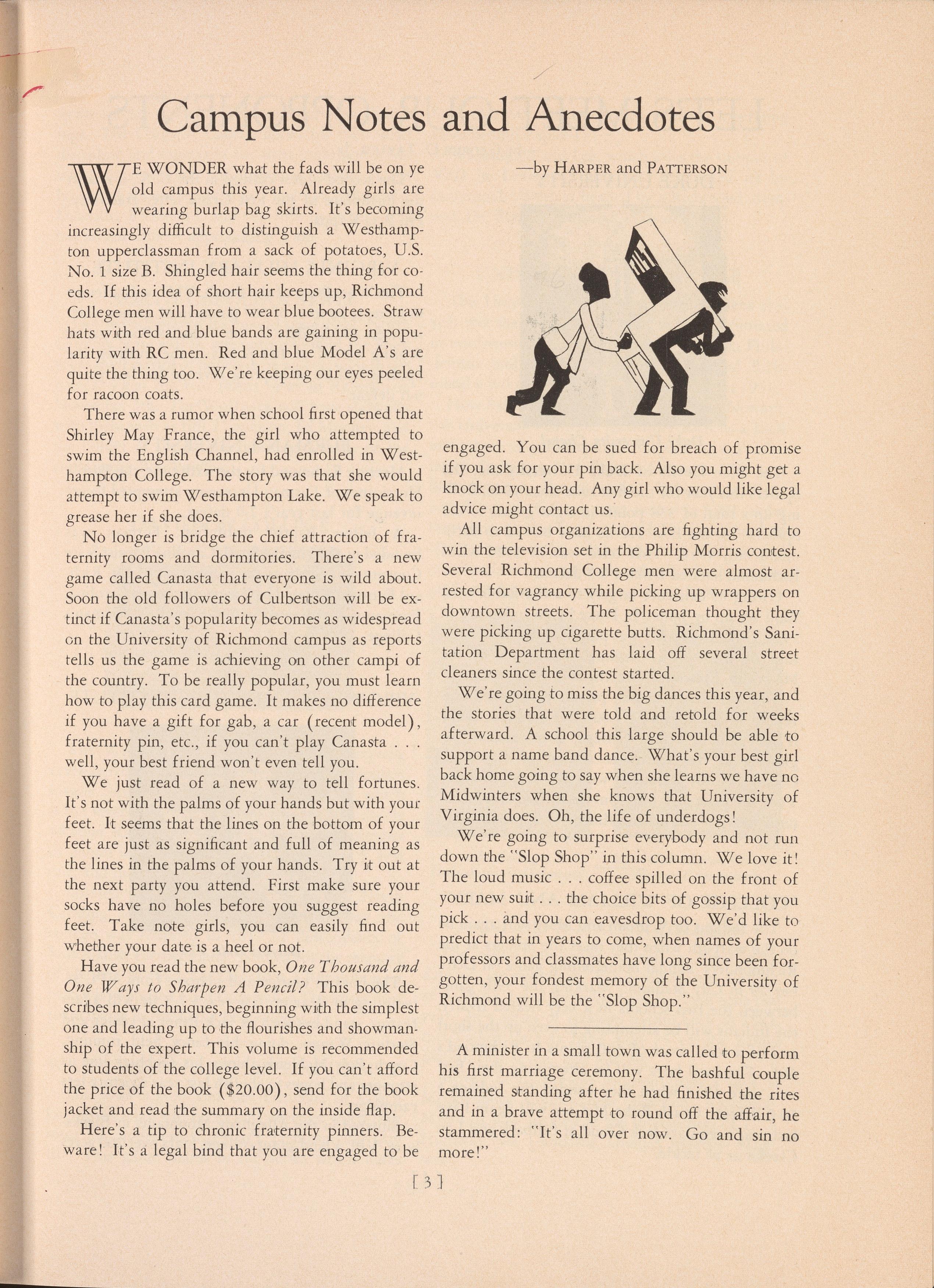 WE WONDER what the fads will be on ye old campus this year. Already girls are wearing burlap bag skirts. It's becoming increasingly difficult to distinguish a Westhampton upperclassman from a sack of potatoes, U.S. No. 1 size B. Shingled hair seems the thing for coeds. If this idea of short hair keeps up, Richmond College men will have to wear blue bootees. Straw hats wi1th red and blue bands are gaining in popularity with RC men. Red and blue Model A's are quite the thing too. We' re keeping our eyes peeled for racoon coats.