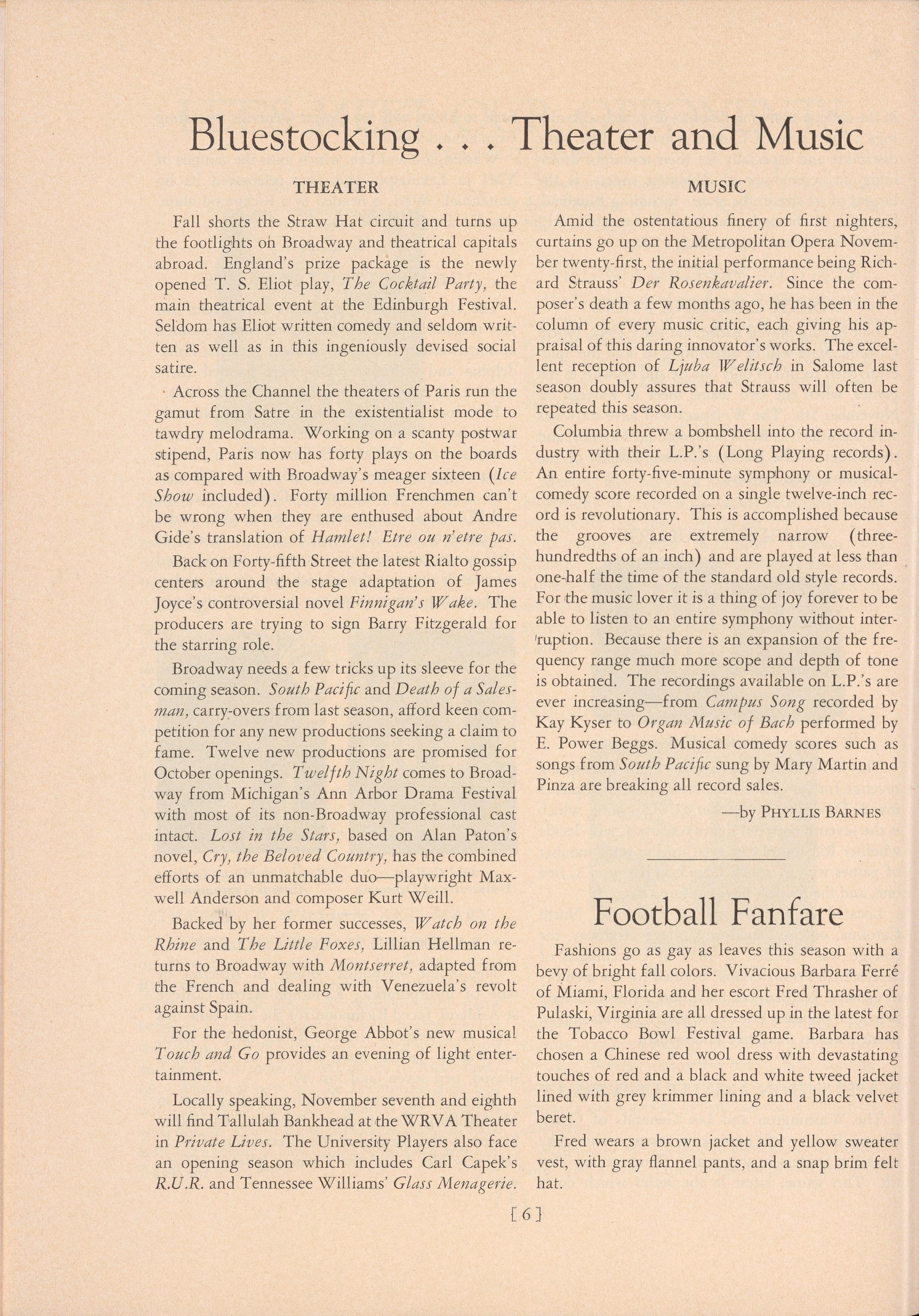 We got here just in time for the kickoff. I'm sorry, was this your hat? There goes the ball! It's a high kick-let's open i:tnow-Richmond returns it to the ten-yard line--who uses chasers? It's a pass. We scored!! Hey, Coke! There goes the conversion. It's good!! Look at the large rolls of confetti everyone is throwing. Since when do they use THAT for confetti? Is the bottle empty yet? Rich mond kicks off, and-what nice looking dolls they have for cheerleaders. Why can't we have those babes on our side? We tackled on the-I wouldn' mix both of them. Where'n the hell's the guy with the cokes? Richmond scores again-hey, wave that ratcap, freshman. Come on, sing, "Up with the ... " Well, you're supposed to know the words anyway. It's half time. Let's skip out so we won't have to use the flash cards. Oh, oh, we' re caught. I wonder how I'll look with a "T" haircut? Listen to the P.A. system. "Let's do trick 47. You up , up there, turn the blue side toward you. O.K. , you've just spelled out Frzynskwyzcs, the referee's wife's maiden name. Very good!"